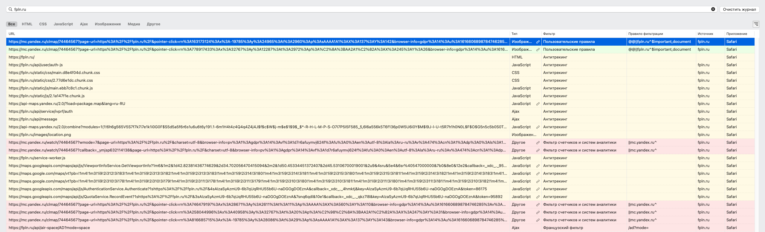 Саша, простите меня, идиота. У меня работал AdGuard в Safari и я забыл выключить его для сайта fpln.ru. Как только отключил его, то все сразу закачалось. Возможно, это поможет и кому-то еще, у кого на компьютере установлен какой-либо фильтр трафика или плагин для браузера, который обрезает трафик и рекламу. Имейте в виду, коллеги, что это может влиять на получение данных на сайте fpln.ru. А вот запросы, которые фильтрует AdGuard на вашем сайте по-умолчанию. Как только отключил фильтрование для fpln.ru, всё заработало.