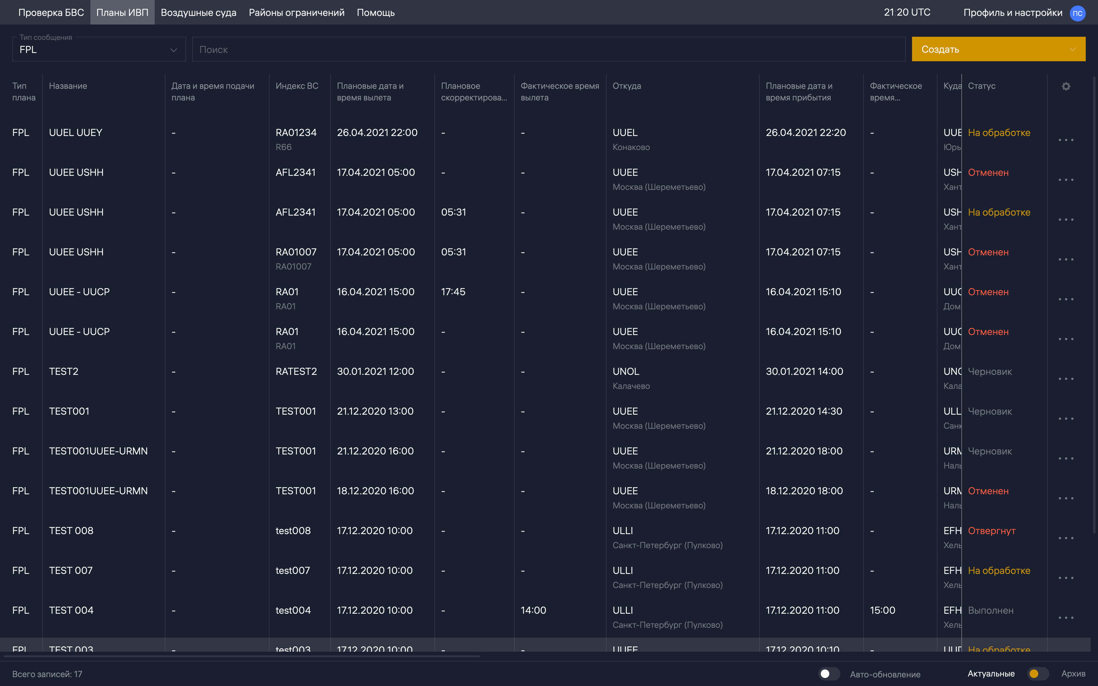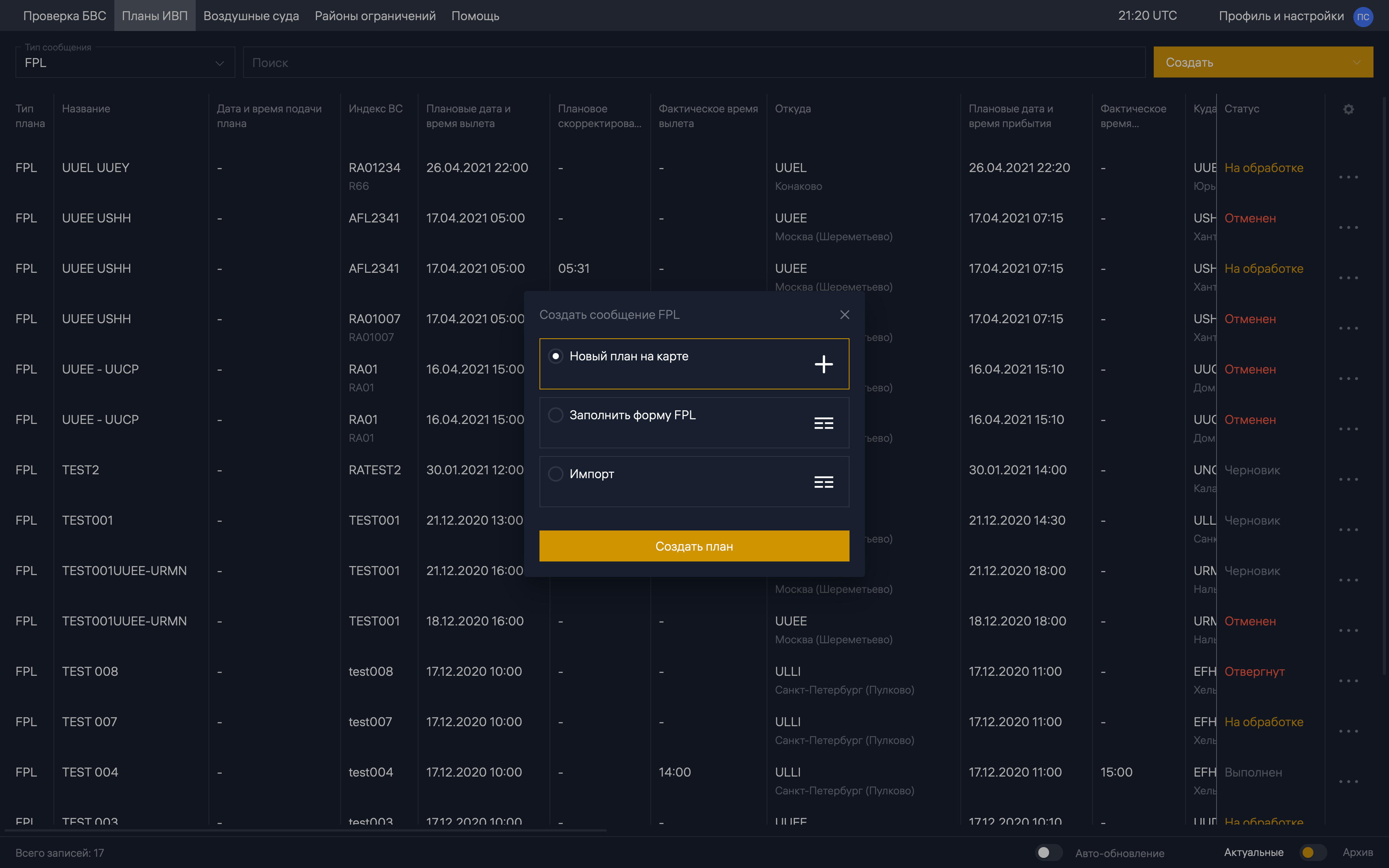 Тоже не согласен. Рассылка планов происходит полностью автоматически, анализируется высота полёта и зоны/районы/РПИ, через которые проходит маршрут полёта.uuee писал(а):Выбор точек "от БАЛДЫ" приводи к распределению вашего плана в другой сектор ОВД, которому вы совсем не интересны, а тот объект которому вы хотите передать свой план информации не получает. Так например вы выбрали точку, которая принадлежит ВТ, а эта ВТ находится в зоне РЦ и ваш план т.о. попадает(распределяется) в РЦ. Поэтому хорошо, что есть такая программа, которая фильтрует такие маршруты.