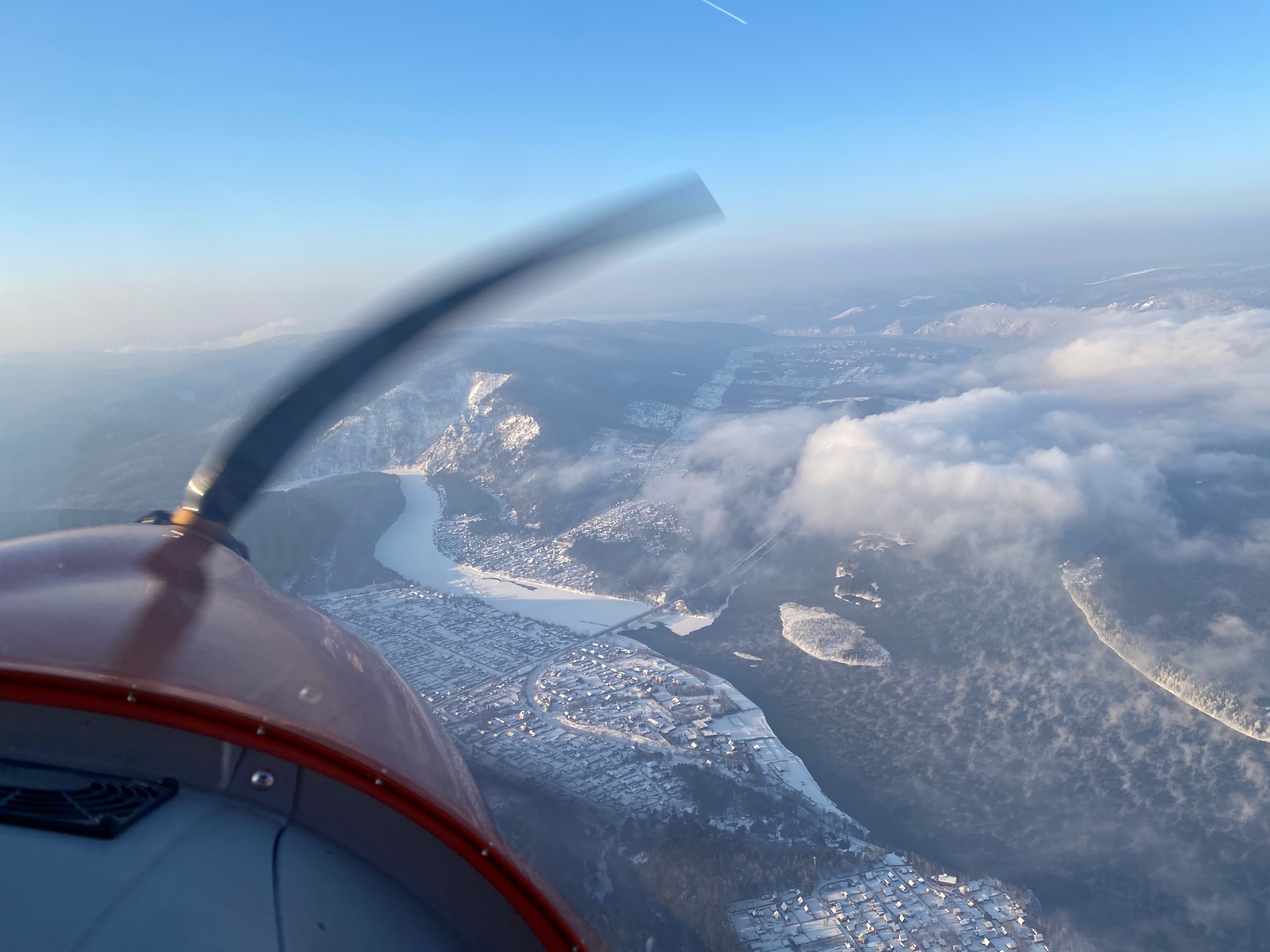 Вчера сибирская погодка подарила превосходный лётный день. QNH 1034, температура за бортом на высоте 1000м. -18 градусов , правда юго-западный ветерок на этой высоте был приличный-40-45 км/ч. Решили вдвоём с товарищем смотаться на нашем Рыжике по красивому горно-речному маршруту до соседнего города Назарово. Заправили 90л. АИ-95. Наш маршрут пролегал над красивыми зимними гористыми берегами Енисея, с выходом на всё ещё, не смотря на середину декабря, свободное от льда (глобальное потепление?) красноярское море в районе ГЭС. Заливы водохранилища, однако уже были белыми от снега лежащего на ледяном покрове, интересно прочен-ли он для приёма на свою ровную поверхность полутонны веса;)? Шли мы на 950-1200 метров по QNH. В кабине настолько тепло, что иногда я прикрывал заслонку тоннеля от двух радиаторов под капотом и излишки горячего воздуха улетали под фюзеляж, согревая Сибирское небо. Атмосфера, несмотря на горный рельеф была совершенно спокойной и с учётом встречного ветра со скорость 40-45 км/ч мы установили режим 5000-5200 оборотов в минуту, приборная скорость при этом составила 185-204 км/ч. Винт на Рыжике-французский DUC регулируемого на земле шага. Вскоре после «бескрайнего моря тайги» к радости любого пилота однодвигательнго сухопутного появились первые большие поля. Подошли к Краснополянску (Красная поляна на картах), но в моем детстве эта замечательная русская деревня звучала именно как Краснополянск (чем мы хуже Красноярска:)? Здесь прошли мои самые яркие месяцы школьных каникул! Мотоцикл «Восход-2М», заправленный слитым с ГАЗ-53 у дяди Гени банкой бензина предварительно размешанного с темно-синим маслом(не помню уже его названия-автол?). Помню незабываемые ощущения от быстрой езды с ветерком по полевым выкатанным в черноземе дорогам-как по немецкому автобану-до того мягко и плавно! Ездил с отцом на импровизированный полевой аэродром за околицей села, куда каждое лето из районного центра прилетал на АХР желтобокий Ан-2. Летчики, которых я считал самыми крутыми и счастливыми людьми на свете (молоденький второй и невысокого роста сухопарый командир-постарше) разрешали посидеть в кабине, куда нужно было протиснуться мимо бака для химии, с непередаваемым «ароматом»! Детство.. Вираж над домами деда Саши-фронтовика прошедшего финскую и ВОВ и дяди Гени (по-моему даже гараж где стоял регулярно угоняемый мной чёрный «Восход») сохранился! Прошли над замечательным аэропортом «Назарово» с асфальтовой полосой 1200м. в СССР он принимал Як-40 летавший два рейса каждый день из Красноярска (расстояние по прямой 145км.) билет стоил 8 рублей. Теперь это посадочная площадка, о которой заботится и поддерживает ее в отличном состоянии местный частный пилот. Даже полуразрушенное здание аэровокзала восстановили! Обидно до боли, что государство никак не помогает, а даже наоборот мешает таким людям. В ангарах живут пара Аэропрактов-22 и один R-44. Летом можно всегда заправиться и переночевать. Зимой ребята летают с укатанной для лыжного шасси полосы. Мы на колёсах и поэтому, к сожалению не можем подсесть на этот гостеприимный аэродром. Облетели Назарово, сверху в центре города хорошо был узнаваем ДК «Угольщик» от которого и ходил в аэропорт желтый ЛИАЗ-677 (с бутылочным звуком под полом). Слетали на угольный разрез, где в СССР работал самый большой в мире шагающий экскаватор(мой местн