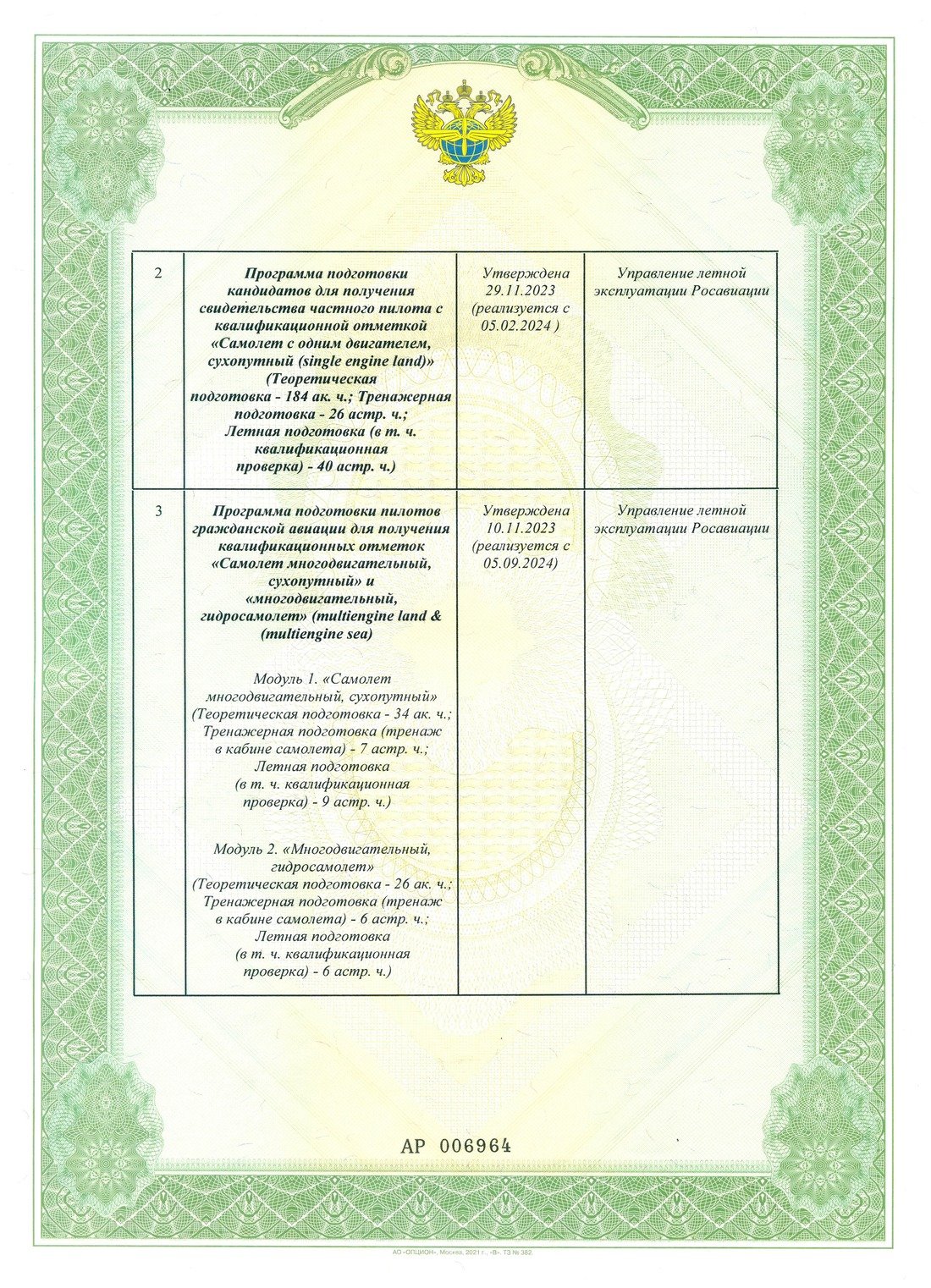 Программа подготовки пилотов гражданской авиации для получения квалификационных отметок «Самолёт многодвигательный, сухопутный (multiengine land)» и «Многодвигательный, гидросамолет (multiengine sea)».