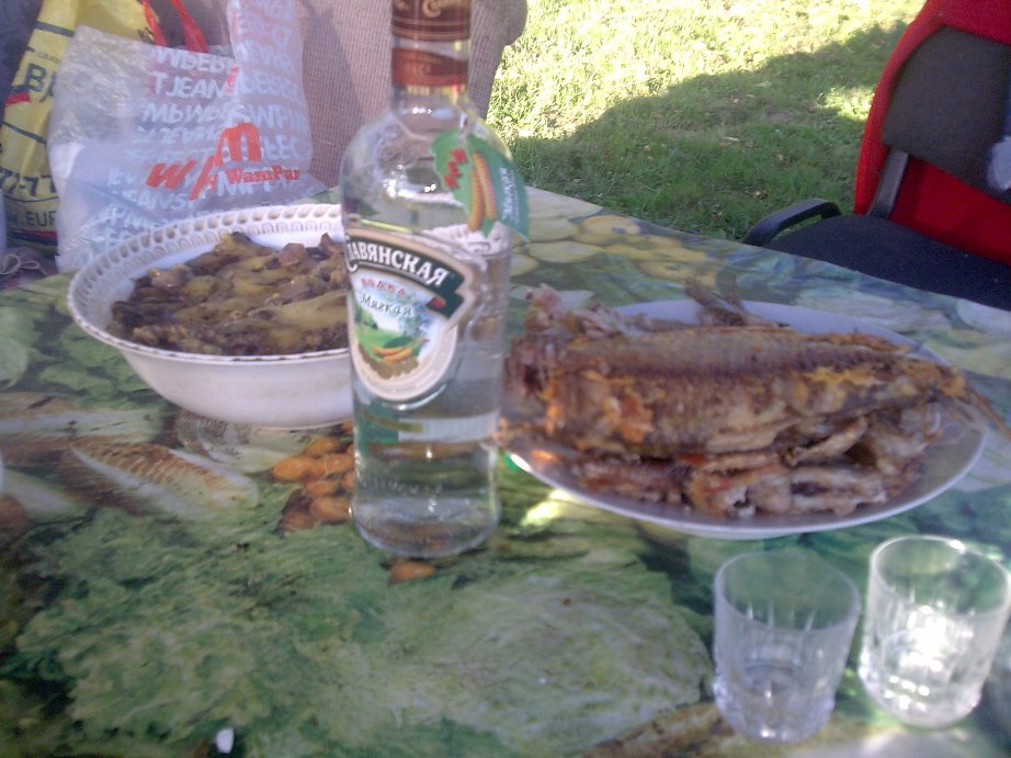 А вот у наша добыча. Свежежаренная речная рыба и жульен(не знаю как правильно пишется это слово, но знаю как вкусно приготовить) из белых грибов.