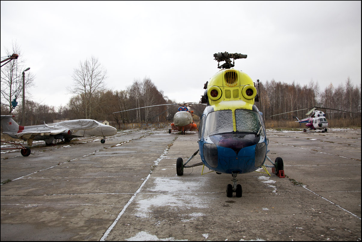 На аэродроме живет с десяток вертолетов Ми-2, один Ми-8 под арестом у судебных приставов и несколько СЛА. Живые вертолеты летают "по трубе", СЛА летом летают на АХР. Все.