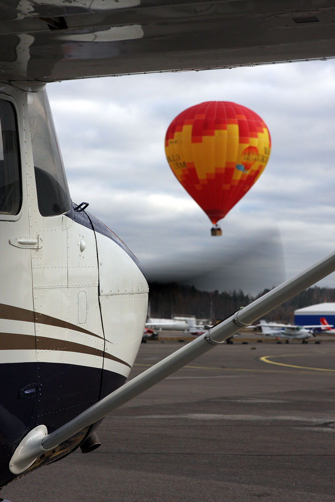 Кончилось все хорошо, воздухоплаватели оказались приличными людьми, корзинку приложили об бетон, сами выпали, шарик сдули. Никто не пострадал. Но в целом было странно наблюдать, как на 150 метрах висит этот пузырь, на 50 метров ниже его взлетает Mooney местной летной школы, а над всем этим взлетает из Vaanta рейсовый ATR-72, метров так на 300 выше этого цирка.