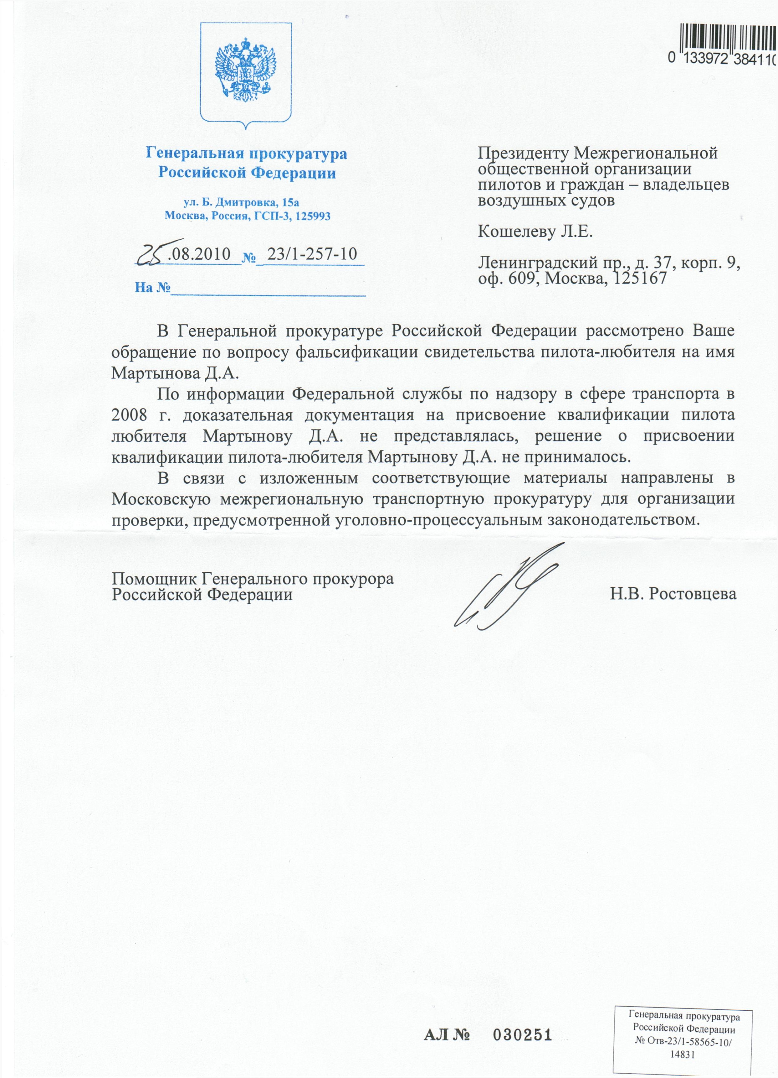 25.08.2010 переправили в Московскую прокуратуру.