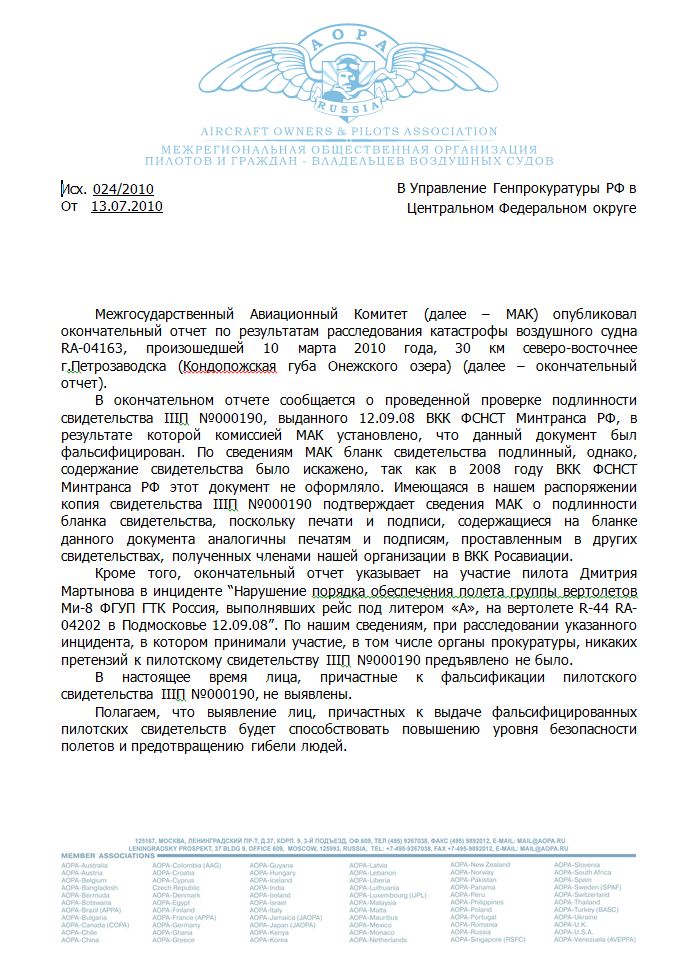 Обращение. Отослано 13.07.2010.502 писал(а):Если Росавиация например за взятку выдало пилотское, то оно тоже может быть сфальсифицированное. МАК не говорит, кто его сфальцифицировал. АОПА готовит обращение в гепрокуратуру с целью это выяснить.Serega писал(а):Пилотское Ян получал в Питере. Допуск на 44-й ему ставил Аэросоюз. Как оно могло быть подложным? У Яна есть свидетельство об окончании курсов учебного центра, есть свидетельство о переподготовке на единичный экземпляр. Как оно может быть подложным?