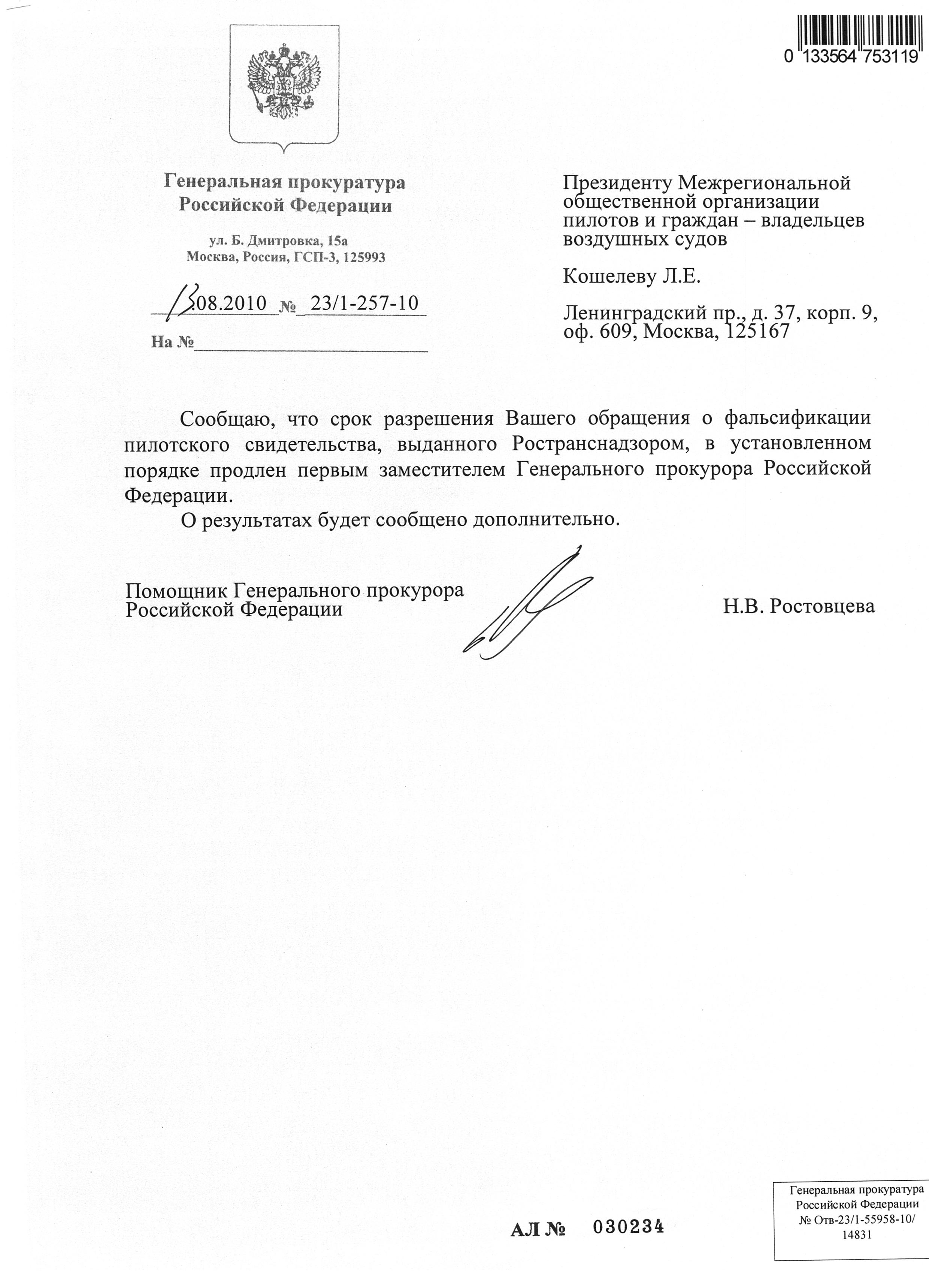 25.08.2010 переправили в Московскую прокуратуру.