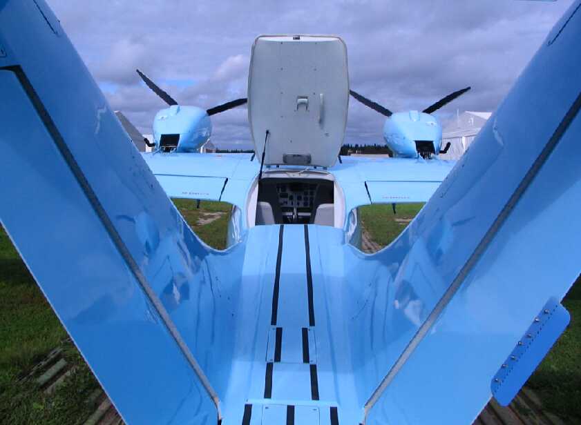 Внешне конструкция самолета кажется не очень прочной, но, очевидно, под тонкой обшивкой есть надежные несущие узлы и лонжероны. Отдельного упоминания заслуживает тишина в салоне, связанная с тем, что, во-первых, сами Ротаксы шумностью не отличаются, во-вторых, они не в фюзеляже а на крыле, в-третьих, плоскость вращения винтов вынесена вперед относительно пассажиров и экипажа.