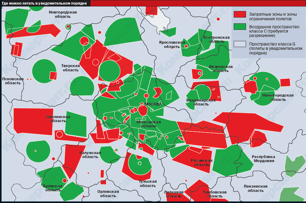 Стоит заметить, что лишь отчаянные оптимисты из числа московских летчиков-любителей ожидали, что 1 ноября в тех местах, где они привыкли летать, заработает долгожданный уведомительный порядок. Ожидания оказались пустыми: по словам председателя правления межрегиональной общественной организации пилотов и граждан—владельцев воздушных судов "АОПА-Россия" Владимира Тюрина, вся Московская область оказалась накрыта воздушным пространством класса С, то есть никакого уведомительного порядка здесь нет. "Такое решение кажется очень сомнительным с точки зрения реальных потребностей. А в Южном федеральном округе верхняя граница класса G ограничена 300 м, что с учетом минимальной безопасной высоты полета оставляет лишь тонкую прослойку для полетов в уведомительном порядке. Есть и вовсе курьезы: некоторое количество регионов на Дальнем Востоке (в том числе Магаданская область, Камчатка) накрыты классом С от поверхности земли. Мы почти уверены, что это сделано скорее по недосмотру, чем исходя из реального анализа потребностей",— говорит Владимир Тюрин.