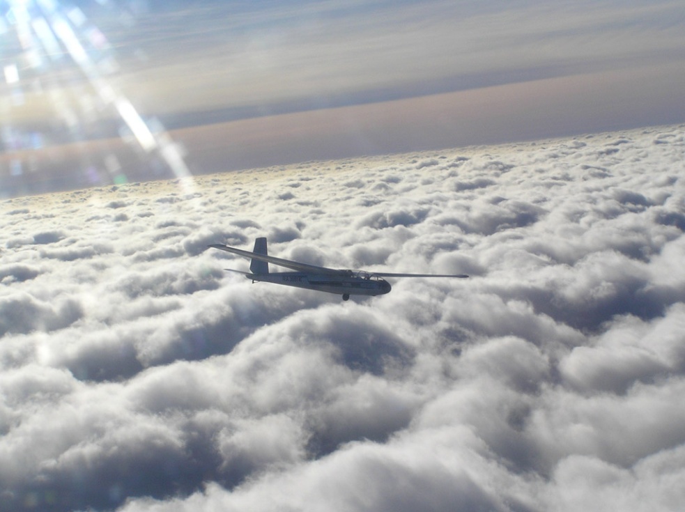 Виток к витку наворачивается спираль. Оживился высотомер, уже прибавилось пару десятков метров. Где-то 850. Поток то сильнее, то слабее. Облако ближе, земля уходит все дальше. Внизу карьеры, вода голубовато-зеленая. Воскресенье. По берегам приткнулись машины. Кто-то греется под солнышком на песочке, кто-то плещется в воде. А кто-то наверняка таращится вверх. Возможно какой-нибудь белобрысый пацан или девочка тычет пальцем в небо (в меня то есть!) и спрашивает: «Пап, а пап, а что это там летает?» И папа, оторвавшись от бутылки пива, как может рассказывает ему про небо, самолеты, ветер и летчиков. И может у этого пацана навсегда по жизни останется привычка, увидев в небе самолет, долго провожать его взглядом и представлять кто же там внутри, что он делает и куда летит. Так было в моем детстве. И хочется надеяться, что не только в моем. Хочется думать, что и сейчас, когда мы стоим на пороге познания тайн гравитации и других принципов перемещения в пространстве полет на планере в атмосфере, в воздушных потоках останется не менее привлекателен для людей чем раньше. Ведь не зря говорят, что «если бы полет был языком людей, то парение было бы поэзией».