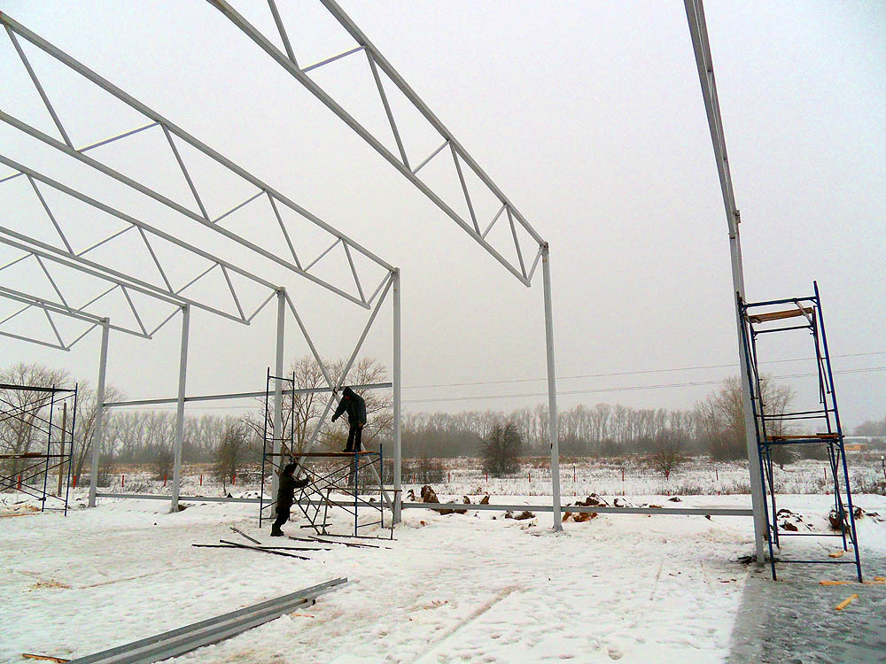 Погоды нынче стоят ужасные. Да и вопрос выбора ворот заставил несколько притормозить темпы стройки, ведь 18-метровые ворота - не пушинка. Они должны на чём-то висеть (а про опору створок на землю и зимние мучения уже выше красноречиво сказано). Таким образом, пока не будет ясности с силовой подсистемой ворот, не очень ясно, как надо (и надо ли) модифицировать конструкцию скелета ангара.
