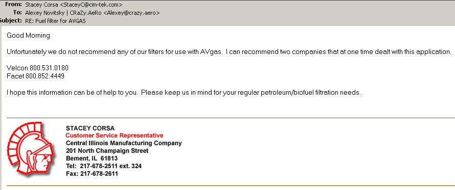 Cim-Tek фильтры использовать с AVGAS нельзя (есть ответ производителя).