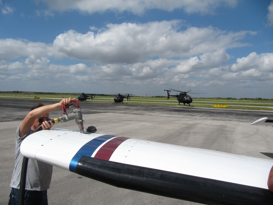 Еще через полчаса, мы подлетели к маленькому аэродрому Хэмстед, недалеко от Маями, с целью подзаправиться и попить кофе. Наши надежды на заправку более дешевым бензином , не оправдались, но все равно, мы залили баки до крышек. Кофе тоже попить не удалось. Зато мы наблюдали три вертушки, которые взлетали строем ( военные все-таки:) ). Потом немного полазили по ангару и по стоянке. Удовлетворив свое любопытство мы снова сели в самолет и отправились дальше.