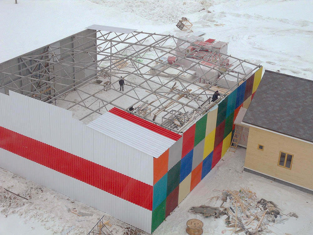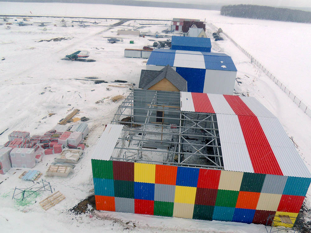 Задний фасад ангара больше не дырявый. В качестве цветового решения выбраны авиационные белый и красный. В таком же ключе будет сделана и крыша.