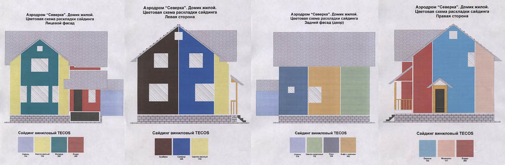 Работы по домику пока приостановлены. Напомню, что сейчас дело за обшивкой внешности сайдингом. А поскольку я объявил войну блёклости и серости, решил, что домик тоже должен быть разноцветным. Тут дело, однако, забуксовало из-за (меня это удивило) отсутствия ярких цветов вагонки. Все больше серые, да бежевые разных оттенков. Тем не менее, углубление в эту малознакомую мне тему выявило, что есть марка сайдинга TECOS, где пусть и не широко, но хоть что-то есть по части выбора цветов. Одновременно выяснилось, что отсутствие ярких цветов у многих производителей вагонки результат того, что цветовой пигмент не очень устойчив и имеет тенденцию к выгоранию на солнце со временем. Может быть, но уж лучше пусть домик хоть сколько-то лет будет ярким и красивым, чем от рождения серым. Никому не доверяя это важное дело :) я открыл CorelDraw! и сам нарисовал проект цветовой раскладки домика (см. вложение).