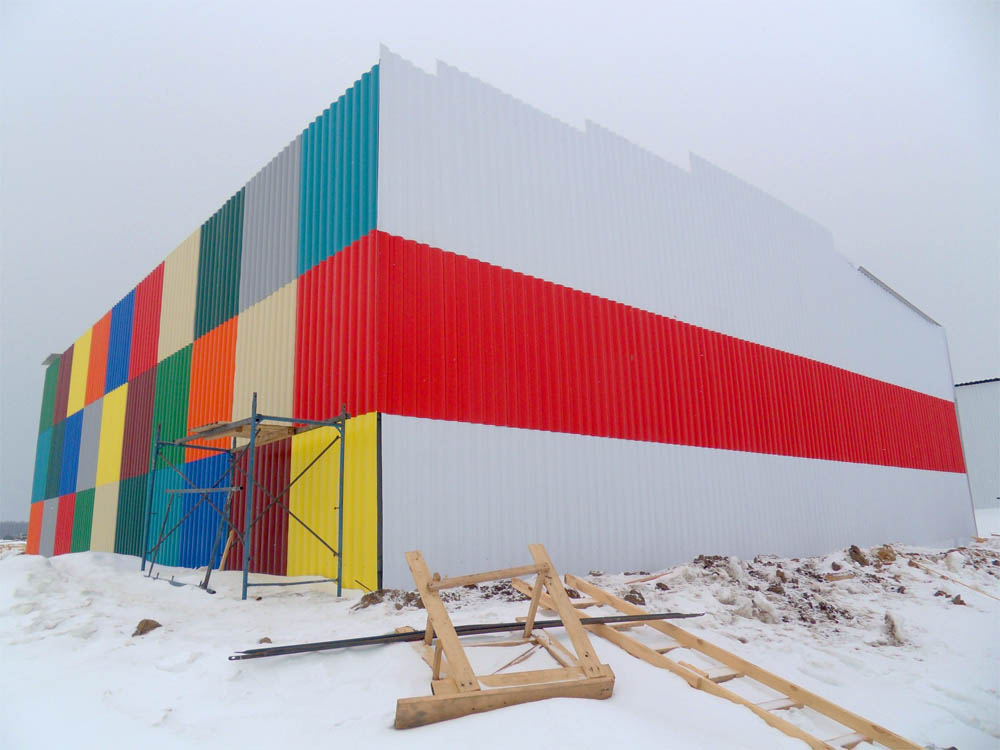 Конструкция рассчитана на профнастил толщиной 0.7 мм, но я выбрал листы 0.5 мм, однако с большей высотой волны (производитель листов - "Металл-профиль"). Это, чтобы не потеряв в прочности кровли, не слишком нагружать вес крыши. Ведь у меня будет еще подшивка снизу утеплителя и стекло-магниевых листов. Для облицовки стен выбран профилированный лист МП-40х1000 (высота волны 40 мм, толщина 0.5 мм) - по проекту минимально 20 мм. Для кровли выбран профилированный лист Н60х845 (высота волны 60 мм, толщина 0.5 мм) - по проекту минимально 40 мм. Кстати, именно по минимальным требованиям выполнен соседский ангар (тот, что синий).