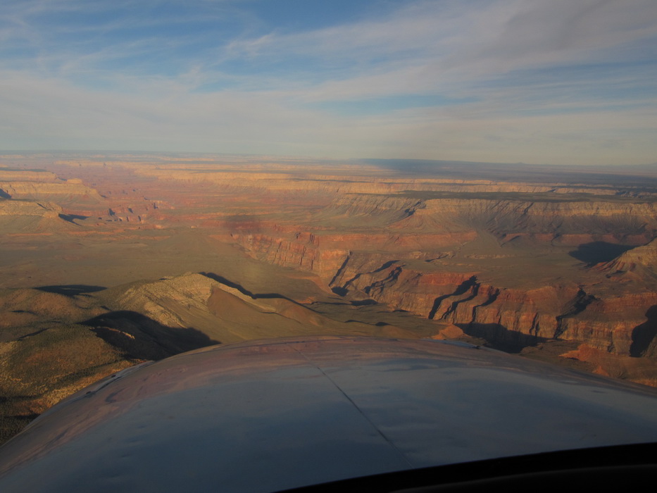 Через час полета мы подощли к Марблe Каньен. Времени оставалось мало и мы могли опять попасть во все блудные с ночной посадкой на незнакомую полосу, а после истории с невключенной полосой в Вегасе, как-то рисковать уже не хотелось. Поэтому мы оказались перед выбором: либо сразу лететь в Пэйдж, либо быстренько-быстренько…. на этом и порешили. В Марблe Каньен надо было «падать» с 10000 до 3600,причем края каньена были на 7000ф. Полоса располагалась под северной стенкой. Падаем до 7000, огибаем северную стенку каньена и ищем полосу. Идем вдоль стенки, постепенно снижаясь, докладываем подход и посадку с прямой. Полосы пока не видно. В каньене солнышка уже почти не видно и полоса плохо различима. И наконец, вот она! Из обещанной ширины в 35футов, реально покрыто асфальтом наверное, метров 7-8 не больше… Мы заходим на эту тропинку, под нами мелькает ущелье, надо же, в каньене есть еще каньен! И прямо перед полосой! Отличный вариант в случае выката! Касаемся асфальта или точнее того , что от него осталось,- разбитый асфальт шириной 7 метров в перемежку с красным щебнем! Долго катимся, стараясь держаться по средине асфальтовой полосы, но кажется, что ее ширины не хватает и винты поднимают мелкий щебень, который бьет по корпусу и стабилизатору… В конце-концов мы до руливаем до стоянки, которым является маленький пятачек, в конце кривой полосы. С трудом примостив самолет, быстро выпрыгиваем из него, и тут случается чудо, самолет покатился! Я в это время сижу за штурвалом и ничего не понимаю! Тяну на себя стояночный тормоз, никакого эффекта, жму что есть силы на тормоза, самолет еще прокатывается метров пять и останавливается. Мы в недоумении… и только отойдя от самолета, понимаем, что пятачек стоянки расположен под таким уклоном, что никакой ручник не удержит. Сидя в самолете мы этого не заметили.