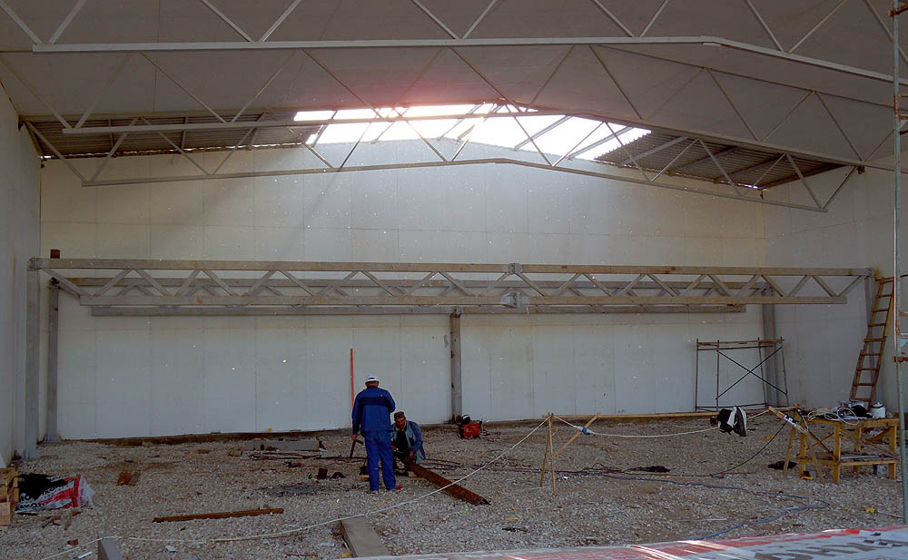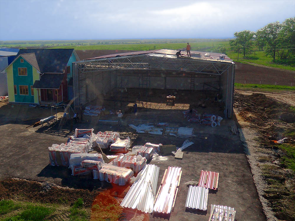 Поскольку перекрытие антресольного этажа проектировалось безопорным (было бы глупо на четверть уменьшать полезную площадь пола), конструкции силовых ферм перекрытия получились очень мощными и тяжелыми (более 5 тонн). Чтобы поднять их пришлось подгонять подъемный кран сзади ангара, разбирать часть крыши и таким образом поднимать перекрытия. Когда мы начали работы по утеплению крыши, мы предусмотрительно не трогали те места, через которые будет тросами работать кран. Так что листы металла просто сдвинули и в кровле образовался проём. На фото он все еще виден, но вскоре всё капитально зашьют и утеплят эту часть крыши ровно так же, как это уже сделали с остальной частью кровли и стенами.