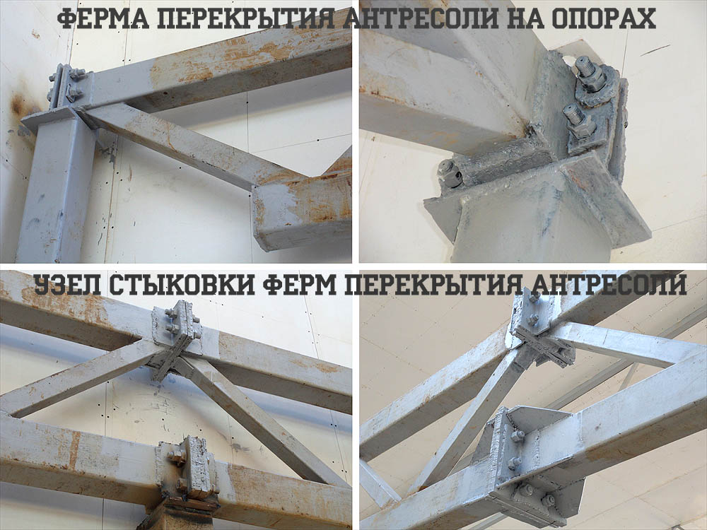 Как я писал выше, конструкция силовой рамы ворот никак не должна касаться собственно ангара и при этом должна держать вес не менее двух тонн (две секции роллетных ворот). Установлена она на собственном заглублённом фундаменте. Ровно так же, как и опоры антресольного этажа. На фото эти узлы показаны крупным планом. Центральный стыковочный узел перекрытий и рамы по моей просьбе был значительно усилен, сверх того, как это предусматривалось проектом. Кроме того, сделали центральную опору перекрытия антресоли там, где она не мешает. По проекту она не предусматривалась, но береженого бог бережет... Я всегда подхожу к таким вещам с принципом "надежность дороже денег".
