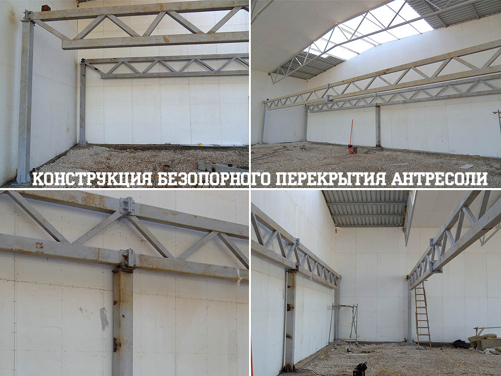 Внутренность ангара с установленными фермами перекрытия антресольного этажа. Проём в крыше (для работы подъемного крана) вскоре будет закрыт.
