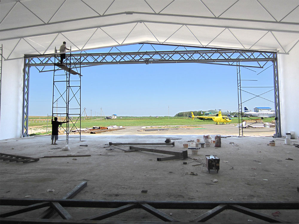 Стандартное решение (на западе) - инфракрасные нагреватели на потолке, работающие от газа. Создает ощущение тепла довольно быстро, но с вертолетами нужно быть особо осторожными - если потолок не очень высокий, то винт оказывается близко от источника высокой температуры, и последствия могут быть нехорошими.