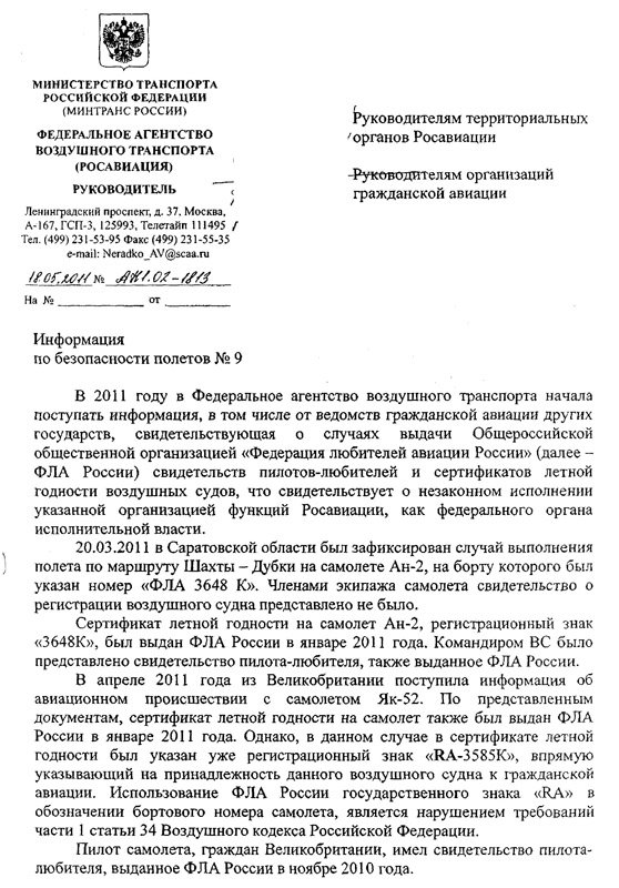 Удостоверение о годности к полётам ВС является внутренним документом ФЛА РФ