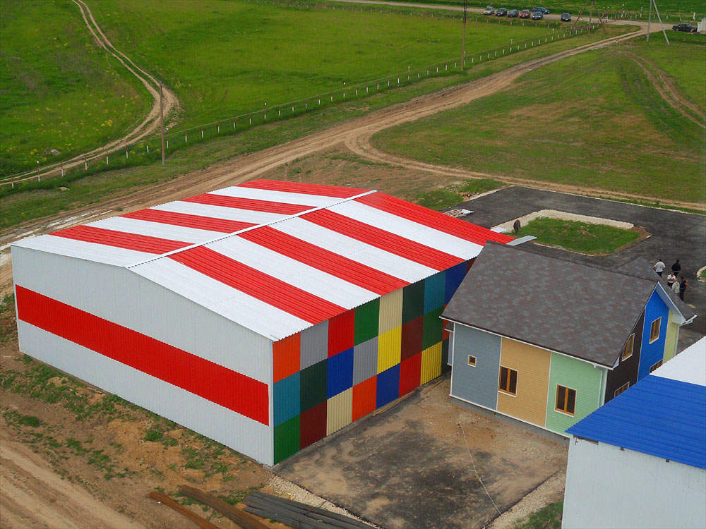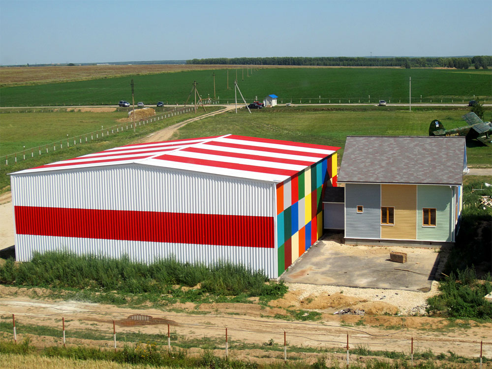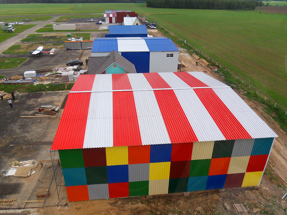Прошедшие 2 недели были затрачены на то, чтобы, наконец, закончить ангар. Нет, он еще не готов окончательно для сдачи в эксплуатацию. Для этого должны быть еще сделаны бетонная стяжка пола и главные ворота. Но, во всяком случае, все стены и крыша полностью перекрыты и утеплены, устранены все недоделки. Крыша, которая так долго "мозолила глаза" мне своей незаконченностью, теперь выглядит так, как было задумано. Не удержался, чтобы не облететь ангар и не сфотографировать эту завершённость. Как видите, на крыше появился конёк. Наружные углы стен закрыты уголком. Им же подшито примыкание крыши и стен с наружной стороны. Кроме того, сделан нависающей козырёк по фасаду, который будет защищать от осадков верхнюю часть ворот (там, где механизмы).