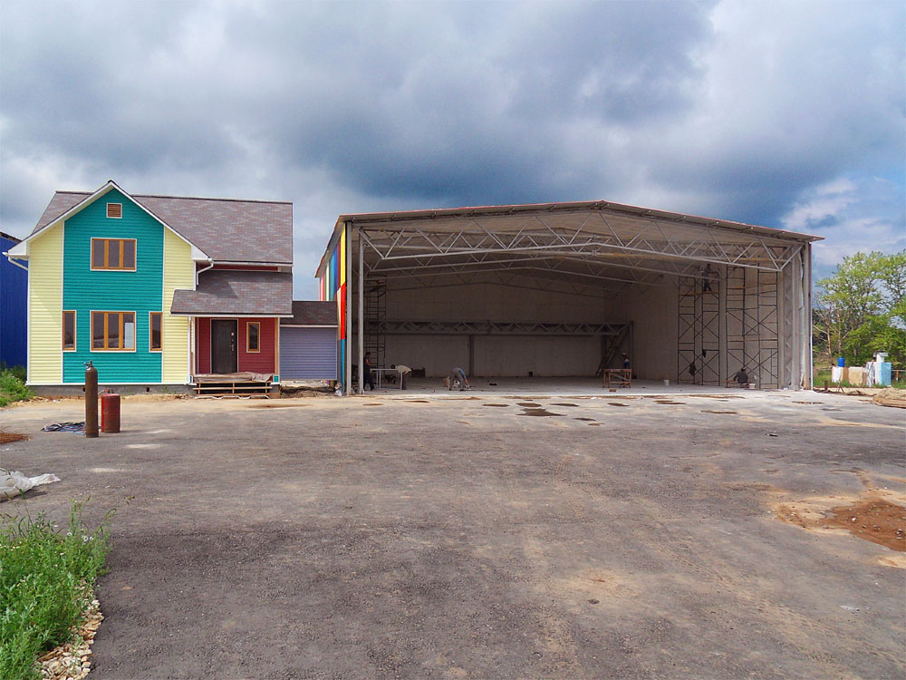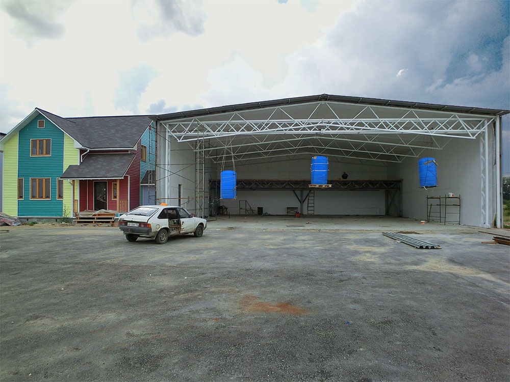 Вид на стройплощадку на 29 августа. Внутри ангара видна гора окон б/у которые будут устанавливаться в ангар для лучшего его освещения.