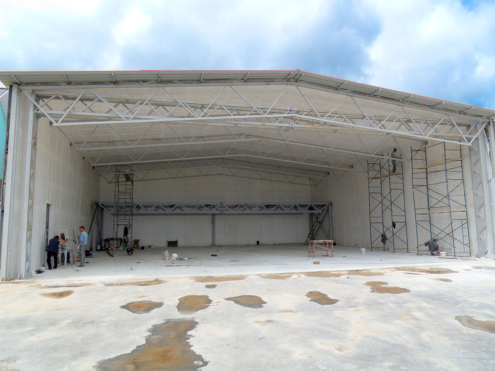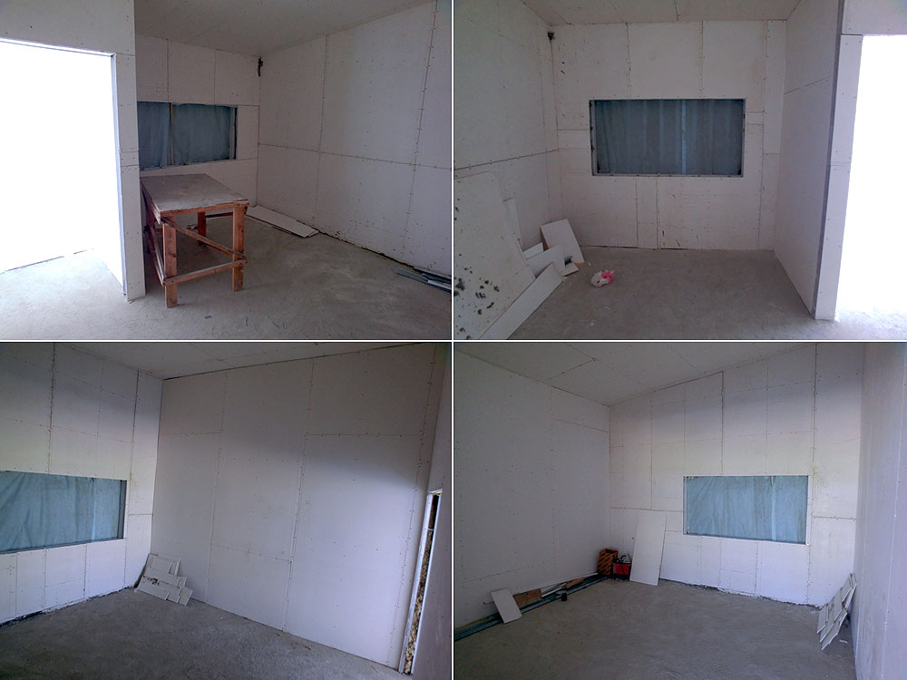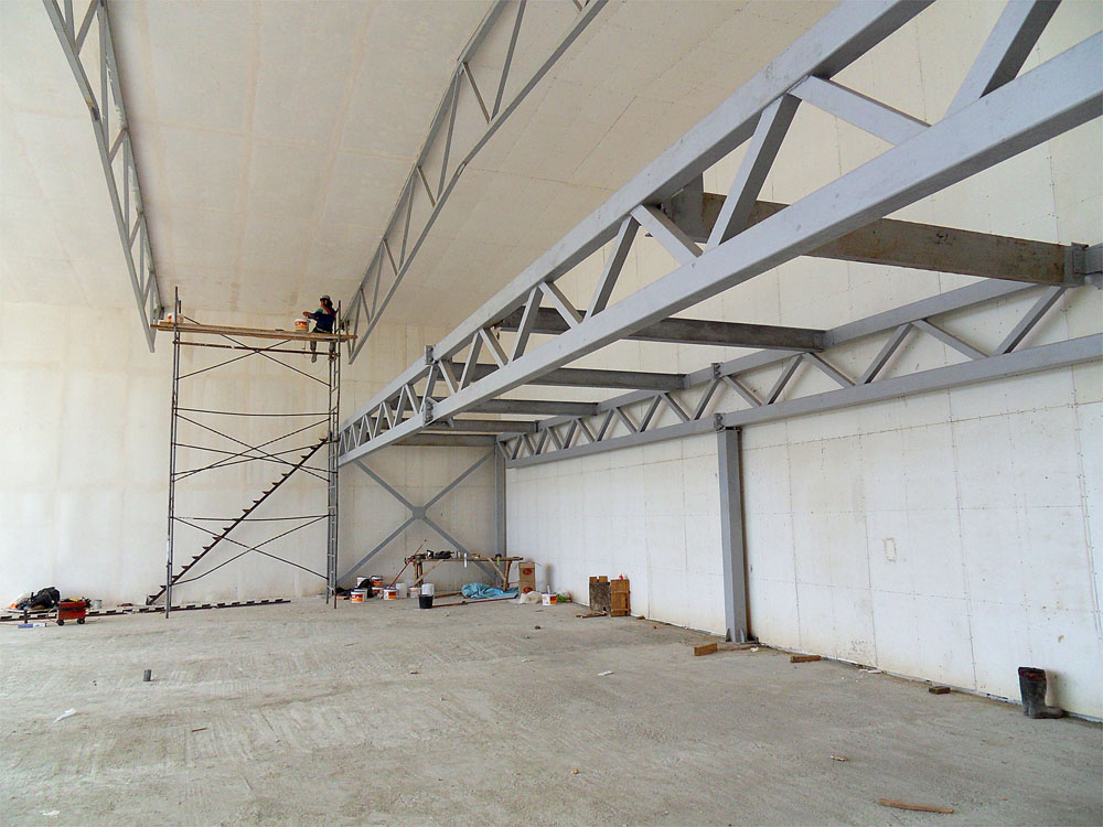 Некоторая задержка вышла с заливкой бетоном антресоли. Идеи по организации пространства второго этажа потребовали дополнительных расчетов прочности конструкции (все должно быть надежно!). Сейчас эти задачи решаются и в ближайшие дни будет осуществлена заливка бетонного перекрытия по несъемной опалубке. Это самые ближайшие планы. Одновременно начались малярные работы по отделке внутренностей ангара. Все швы между облицовочными стекло-магниевыми плитами будут проклеены серпянкой, швы, щели и неровности зашпатлеваны, а затем пойдет окраска в 2 слоя. Кроме того, все металлоконструкции (фермы, опоры и перекрытия) которые сейчас окрашены противокоррозийной серой краской, будут тоже окрашены белой краской. Вся внутренность ангара, таким образом, будет белой, что правильно для организации внутреннего освещения.
