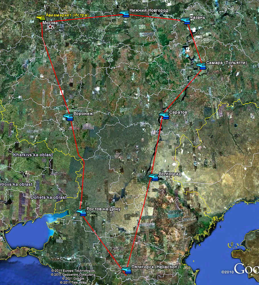 Несколько бортов одного небезызвестного вертолётного клуба решили слетать на КавМинВоды, а вернуться, двигаясь вверх по великой русской реке. Грубая схема маршрута показана во вложении. Цели маршрута - чисто развлекательные, туристические и отдыхательные. (Хотя в нашей стране любое такое событие несет также и характер рекламы и пропаганды. Чем больше будет в небе жужжания АОНовских бортов, тем лучше.)