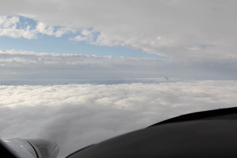 Часа через два полета мы вдруг выскочили из облаков и слева от нас открылось небо. Именно слева, просто облака расслоились, и мы летели в этом расслоении. Снизу облака, сверху облака и с права , очень интересная картина, я попросил Била взять управление и начал фотографировать. Мое счастье длилось не долго, минут через десять облака сомкнулись и мы снова оказались внутри них. Мы выходили из облаков наверное еще пару раз, минут на пятнадцать не больше.