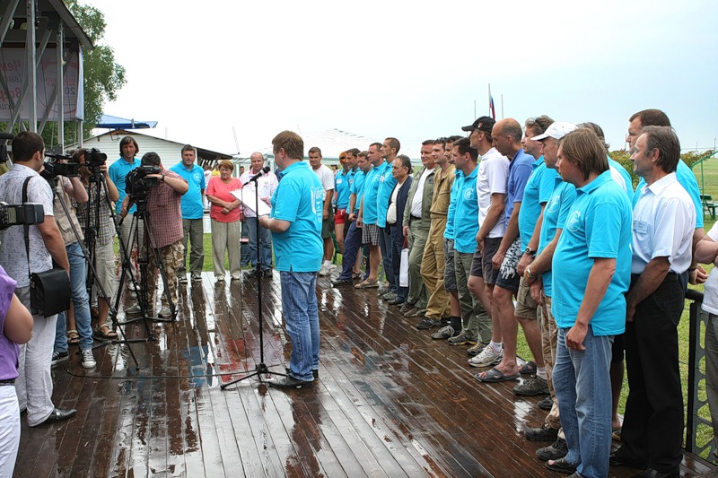 В 15:00 планировалось торжественное открытие Чемпионата, но погода внесла врасписание свои коррективы. Спустя полчаса, когда проливной дождь закончился,гости и участники соревнований вышли под открытое небо.