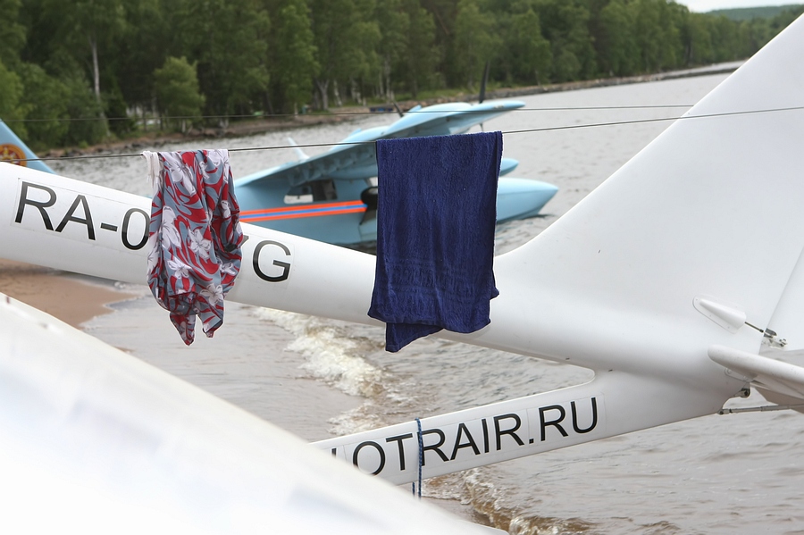 Однако, приходиться оторваться от еды, питья, общения - на берегу озера подходит к завершению операция по спасению попавшего в неприятности при посадке Пеликана. Волнами оторвало правый буль-поплавок: