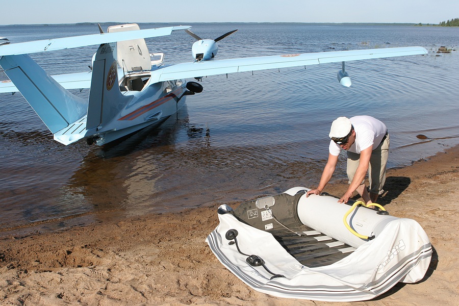 А Лодочник, надув лодку, тоже отправляется экзаменовать стоянку для своего самолёта: