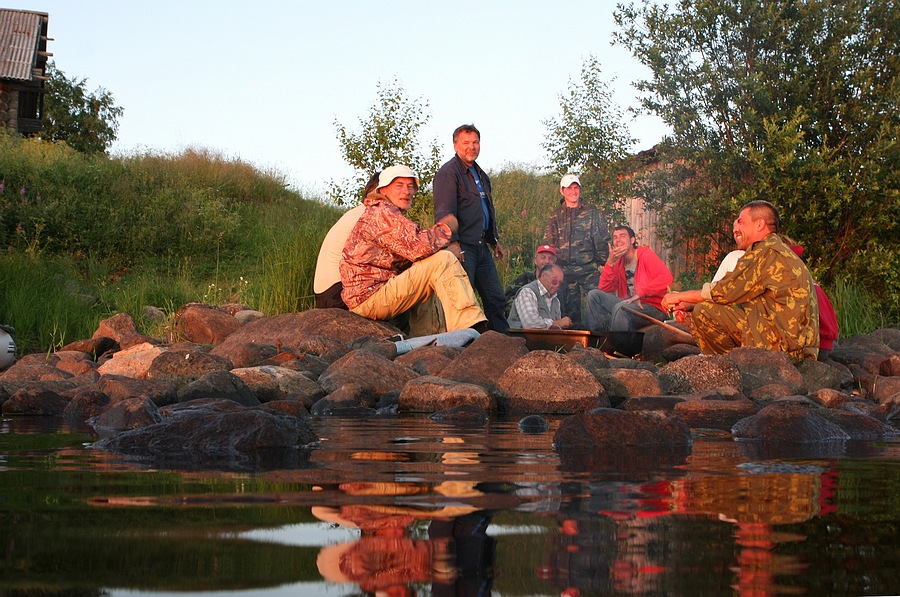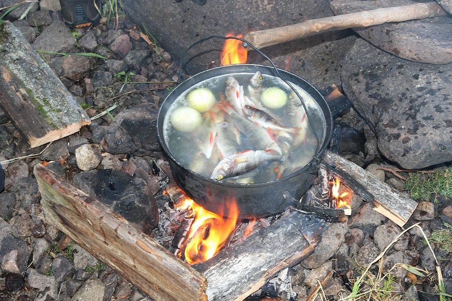 На завтрак питались чаем, копчёной колбасой, доедали вечернюю рыбу. На обед, макароны с тушёнкой, на ужин уха, жареная или копчёная рыба. В общем не голодали. Вода из озера. Про другие напитки умолчу.