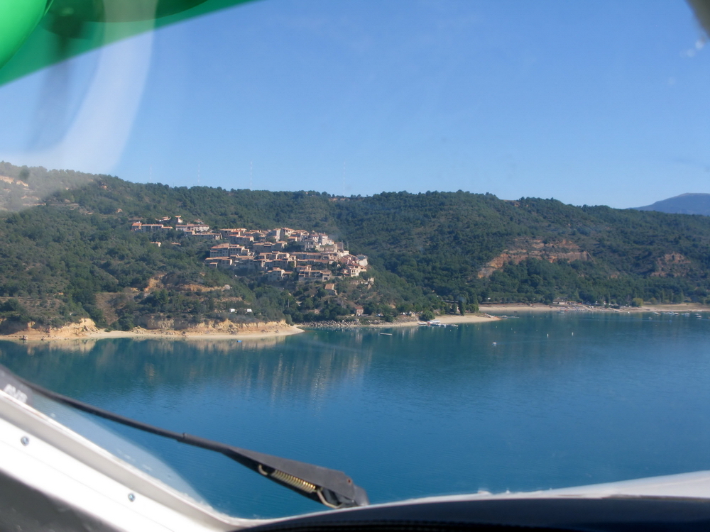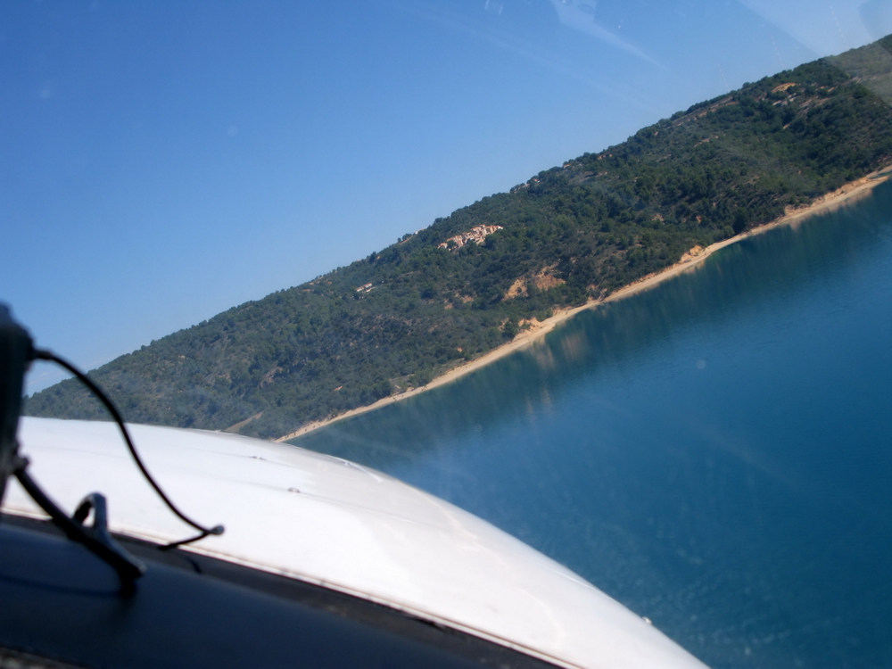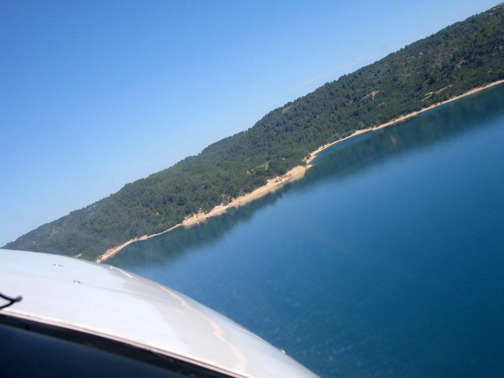 И тут впереди видим красивейшее озеро Lac de Castillon соединенное узкой протокой с Retenue de Chaudanne и не вынесла душа поэта - отворачиваем к озеру. Оно наполовину находится в запретке, так что мы подходим максимально близко к этой запретке и снижаемся в сторону озера.