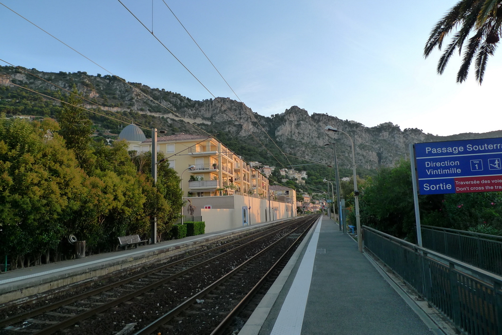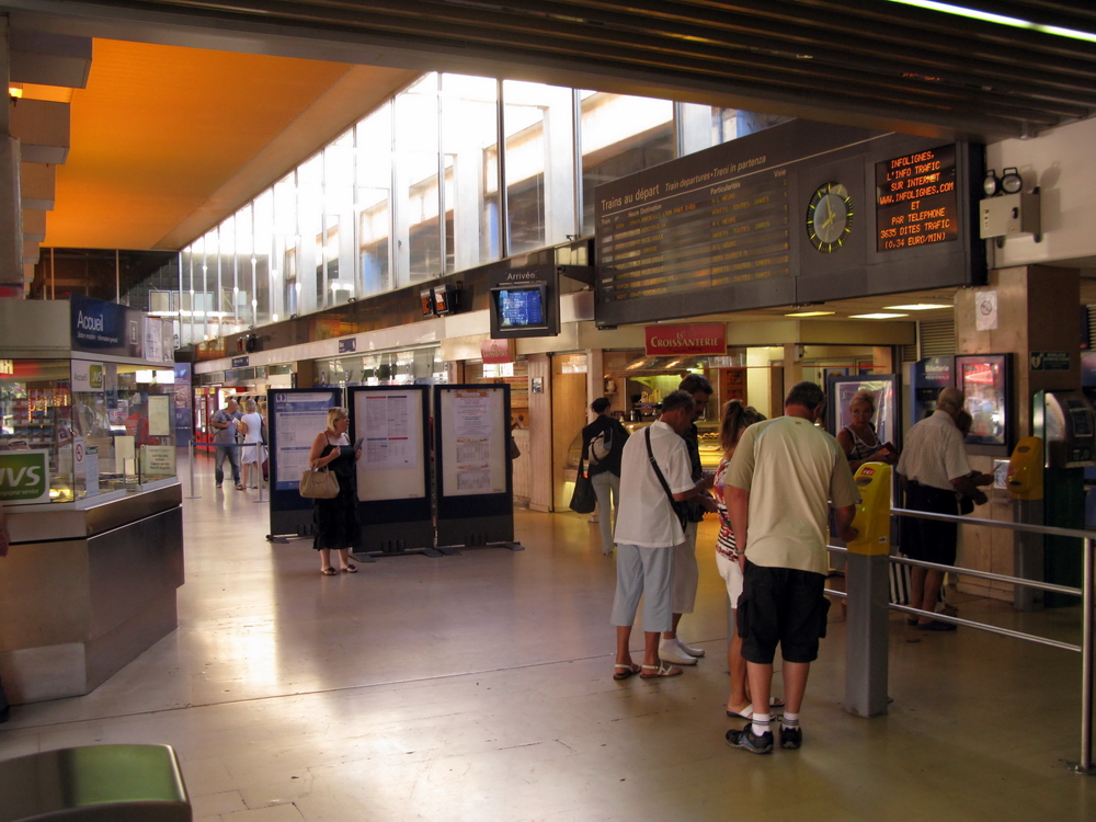 Быстро доезжаем до Ниццы, поезд идет вдоль автобана и отчетливо обгоняет машины, однако быстрее получится, чем на машине. Поскольку мы так и не посмотрели, где же нам выходить, пытаемся определиться по Гарминке с не очень большим успехом. Хорошо, Валера идет опрашивать местное население по принципу "язык до Киева доведет". Быстро понимаем, что в Киев нам точно не надо :) Быстро прикидываем варианты: ехать до ближайшей станции к порту - есть шанс, что оттуда будет не добраться, предлагаю выйти на вокзале в Каннах, там точно можно будет такси взять и доехать до аэропорта. Ага, недооценил я Францию :) Вот уже и вокзал на горизонте, поезд останавливается, выходим. Доехали довольно быстро - за 40 минут всего.