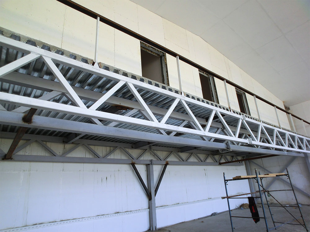 Прошла неделя. Дело движется... Наконец, смонтирована многострадальная ферма усиления антресоли для устройства балкона. Дополнительно, пользуясь случаем, проварили многие швы, поставили дополнительные дополнительные перемычки и укосины для повышения прочности и надежности всей конструкции. Сверху вся антресоль застелена профлистом и вовсю идет работа по вязке опалубки. Скоро сюда будет залито порядка 6 тонн бетона, который схватившись, станет дополнительным элементом жесткости - эдакая единая плита на всю ширину ангара.