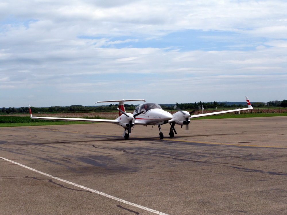 Быстро оттормаживаемся и рулим в сторону перрона, дама на вышке говорит - можете вставать, как хотите. Мы хотим поближе к выходу с поля, но стоянки там нет. Видя, что мы встали не на отмеченную стоянку, а абы как, дама волнуется и дает комманду занять стоянку N2, ибо на стоянке N1 стоит Diamond 42 Swiss training academy, мы разворачиваемся задом наперед (ну удобнее нам так), дама уже не возражает, видимо по принципу - да ну их, этих русских.