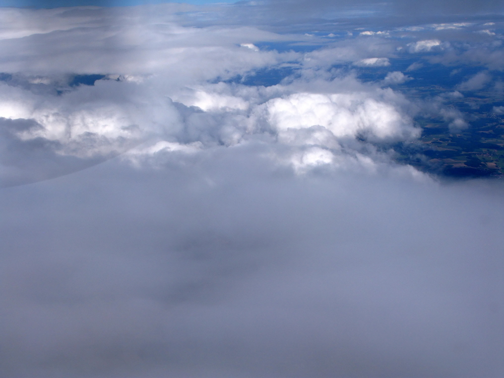 Идем полностью в облаках и это Валере не нравится, на 70м эшелоне температура 12 градусов и много много воды, поэтому просимся повыше, на 90й, и вот становится все светлее...еще светлее и оп, пробиваем всю эту серость и мокрость, и вот она красота - кругом море облаков и светит солнышко. Местами шапки торчат выше нашего эшелона, но нас это не сильно беспокоит, визуально видно, что кучевка не очень злобная, и это точно не грозовые облака, а температура не позволит образоваться льду, она держится около 7 градусов, нагрело уже солнышко, несмотря на то, что воздух холодный пришел с Атлантики.