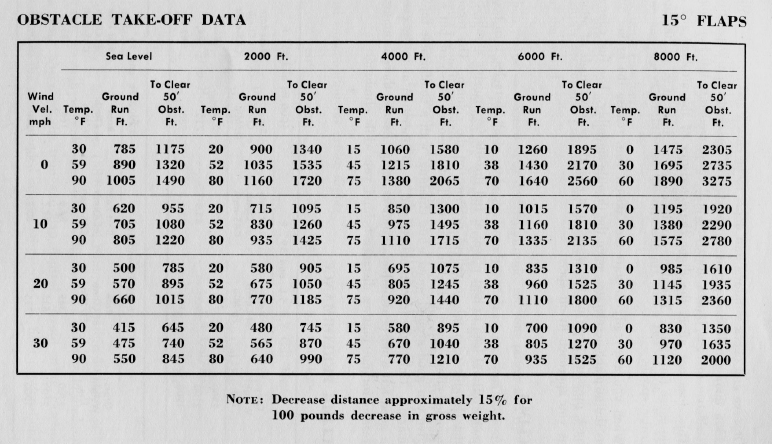 Болею. Есть время покопаться в бумажках. Обнаружилась среди них забавная книжица, которая носит название Owner's Manual: Год издания 1963! Видимо, раньше она выступала вместо Pilot Operating Handbook. Книжечка по объему гораздо тоньше и меньше, чем действующее РЛЭ (POH), которое, собственно находится у меня в самолете. Однако, в ней я обнаружил большинство информации, которая имеется в РЛЭ, причем с пояснениями и фотографиями, и кое-какую информацию, отсутствующую в РЛЭ. В частности в РЛЭ вообще не говорится про посадку и взлет с коротких или заросших полос (как раз мой случай), там даже не упоминается про положения закрылков 15 и 30 градусов - есть только UP и DOWN. В Owners Manual об этом рассказано довольно подробно и приводится соответствующие таблицы, например (для взлета в условиях препятствий): Конечно, это довольно очевидно, что при наличии промежуточного положения закрылков в 15 градусов взлетать с короткой полосы будет удобнее именно с таким положением закрылков, чем вообще с убранными, в чем я убедился опытным путем. Тем не менее, интересно, из каких соображений выкинули все это из действующего РЛЭ? Наверное, в Штатах уже не осталось коротких или заросших полос...