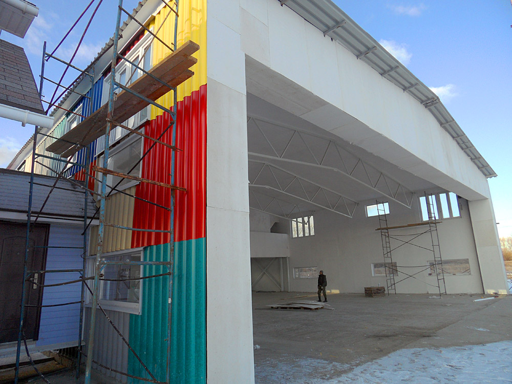 После установки ворот, наконец начались работы по зашивке и утеплению фронтальной части ангара. Эти работы тоже еще не завершены, но к концу ноября будут полностью выполнены, что позволит полностью перекрыть периметр ангара от холода и создать внутри комфортные условия для окончания внутренних отделочных работ по ангару.