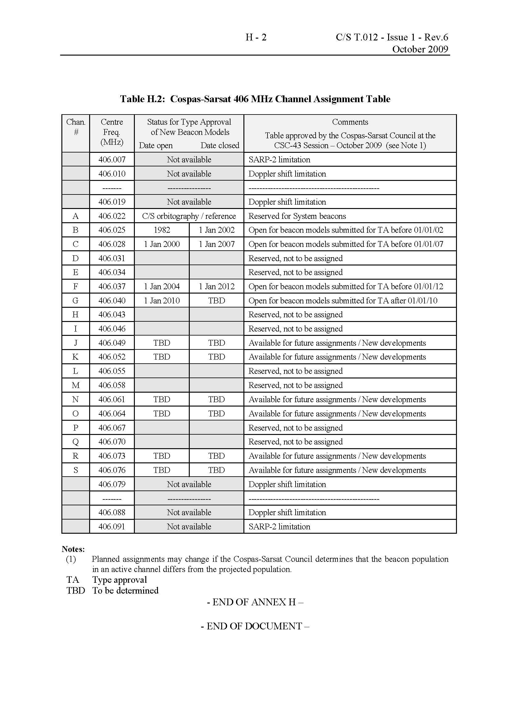To ensure adequate System capacity and an efficient use of the available frequency spectrum in the band 406.0 - 406.1 MHz allocated by the ITU for the operation of low power satellite emergency position-indicating radiobeacons, a number of channels have been defined in the allocated band and will be assigned by Cospas-Sarsat from time to time, as necessary to satisfy capacity requirements.