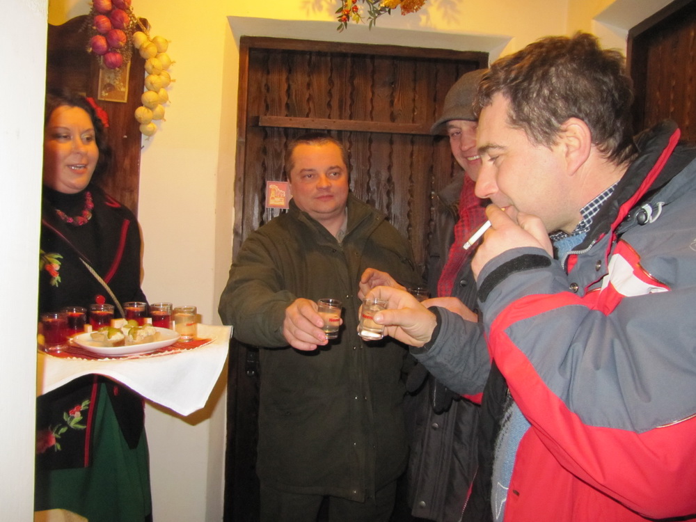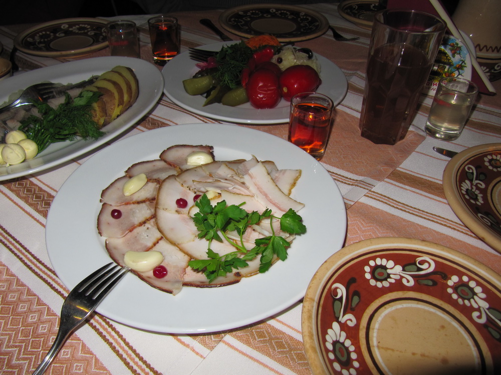Потом мы поехали в какое-то национальное заведение с украинской кухней. Названия я не помню, потому как прямо на входе нам вручили по стопке чего -то крепкого, спели что то национально- патриотическое и вручили меню... Еще через час я с рвением голодного ефрейтера поглощал украинскую кухню в виде борщей, вареников, ассорти из сала и разнообразных закусок, заливалость все это волшебными напитками типа , медовухи и хреновухи. В довершение ко всему, трио украинских хлопцев задушевно исполнило пару песен из кинофильма "В бой идут одни старики." Покидать заведение уже небыло сил... помните- "... ты заходи, если шо...", вот так и у меня примерно получилось. Только я открыл дверь на улицу и вдохнул прохладного воздуха, тут как тут опять эта баба ряженая с стопкой "на посошок!"