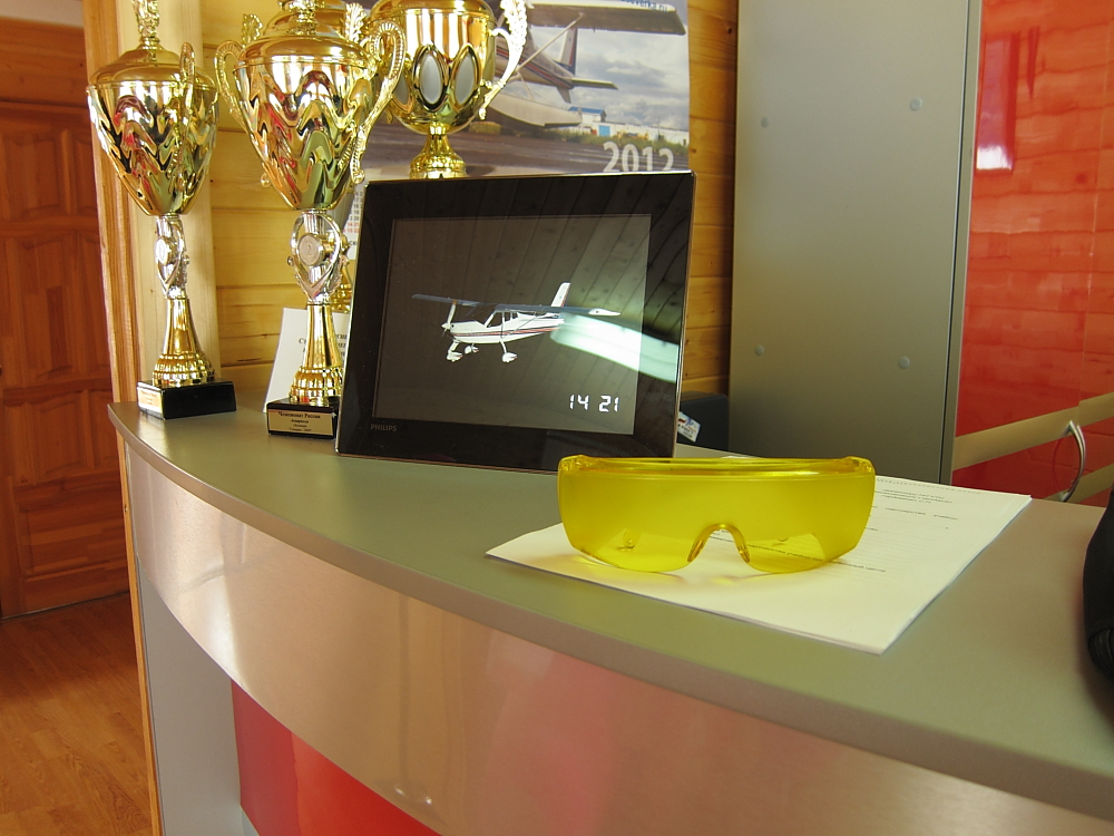 Мой инс получает у администратора очки с закрашенными стеклами в матовый желтый цвет нижняя часть которых прозрачна и позволяет смотреть вниз. Небольшая подготовка к полету и мы взмываем в небо и отходим в пилотажную зону.