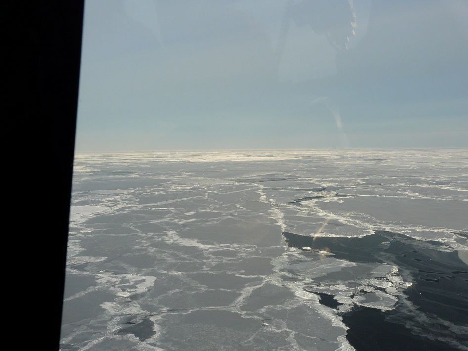 Как я уже писал выше, в Летней Золотице мы берём на борт Олега и сразу летим смотреть бельков. Это примерно 90 км в открытое море. Когда берег остался далеко позади, я немного загрустил. И судя по напряжённым голосам в эфире, не я один. Мы летели на однодвигательных вертолётах над холодной водой и льдами, которые никак не смогут выдержать посадку вертолёта.