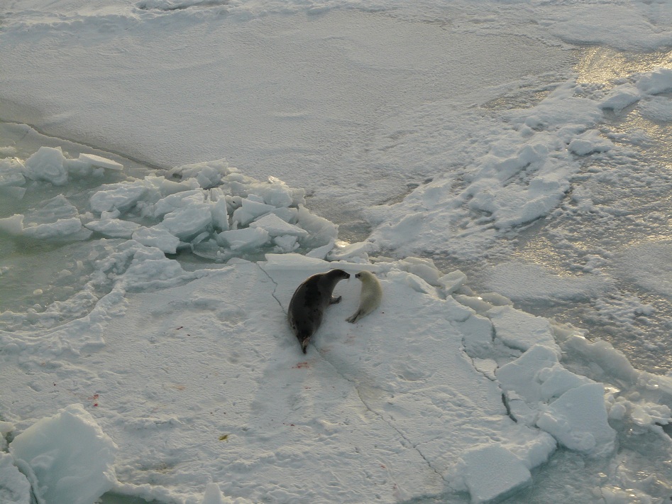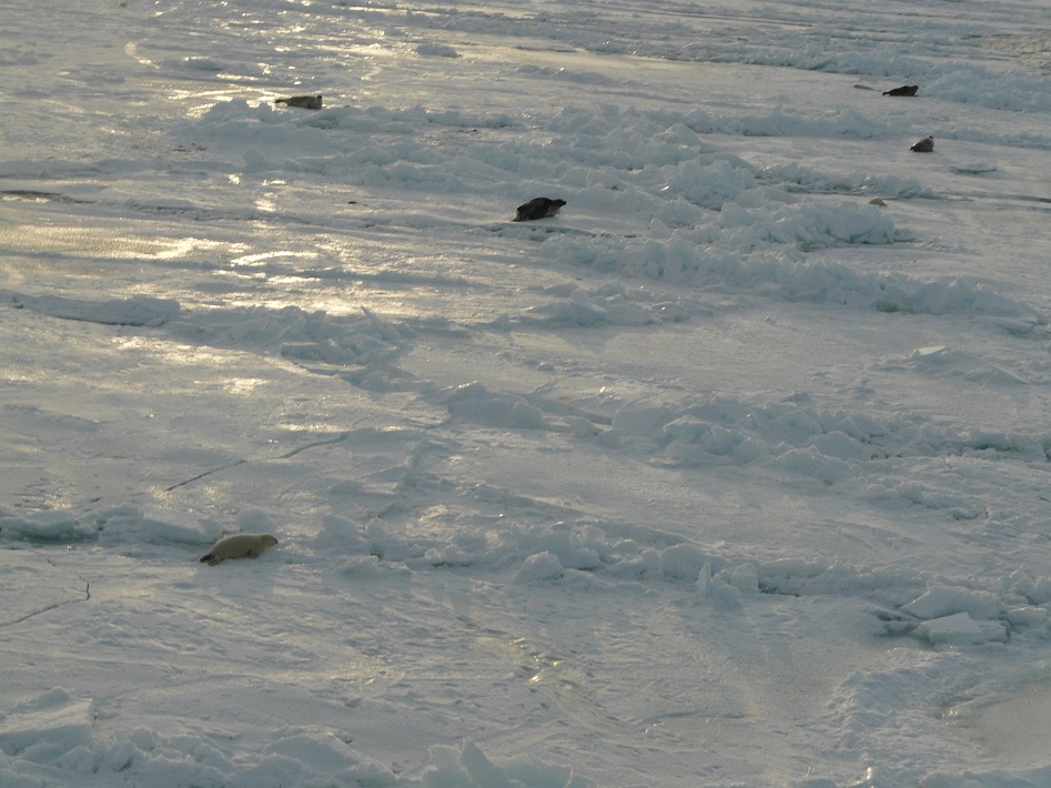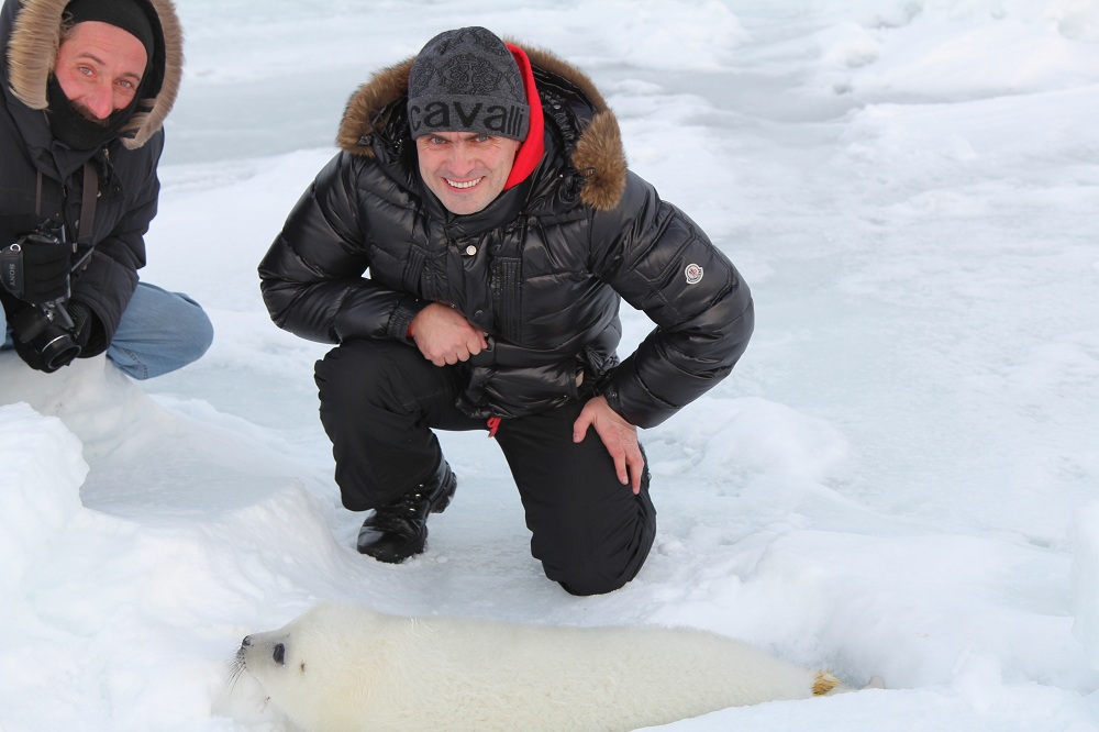 И вот, на горизонте наконец-то появились льдины нормального белого цвета. А на них зверьё местное. Кто-то тикал от вертолётов, а кто-то уже привык и продолжал делать свои дела. Садимся. Посадка сюда тоже интересная. Прежде чем до конца опустить шаг и убрать обороты, нужно было пару раз конкретно стукнуть вертолёт о лёд, чтобы проверить прочность льда.