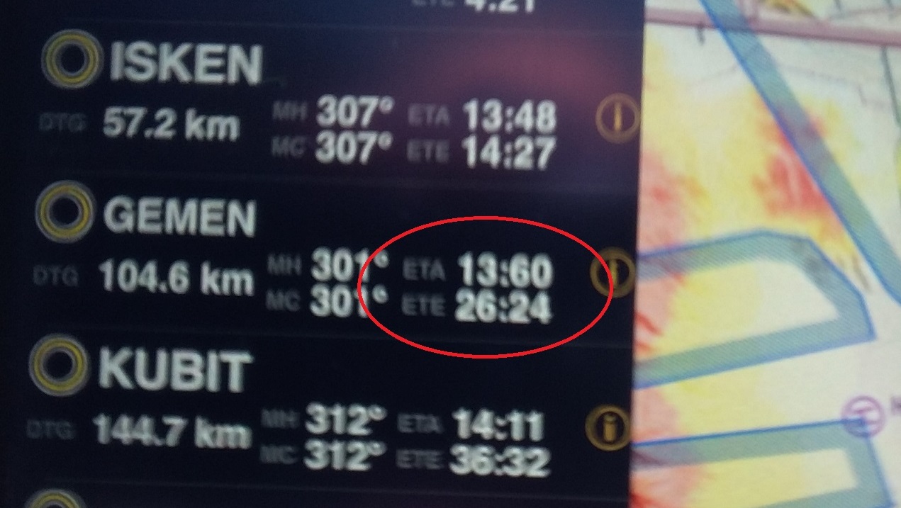 сегодня удалось запечатлеть этот баг и мне.. ))Faza писал(а):ЕТА очень часто показывается как 11:60 вместо 12:00, подтверждаю, не далее как позавчера наблюдал... ))ksv писал(а):Вы не путаете ETE и ETA? Если речь об расчетном времени прибытия (ETA), то там указывается абсолютное время в часах и минутах. А если расчетное время полета до точки (ЕТЕ), то там в минутах. Может поэтому вы видите 60 минут?PonizOff писал(а):И второй баг который мучает, расчётное время прибытия [пролёта] пишет иногда не 00 а 60, глаз аж раздрожает, меняю скорость специально что бы этого не видеть!
