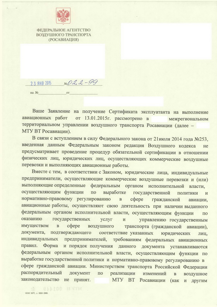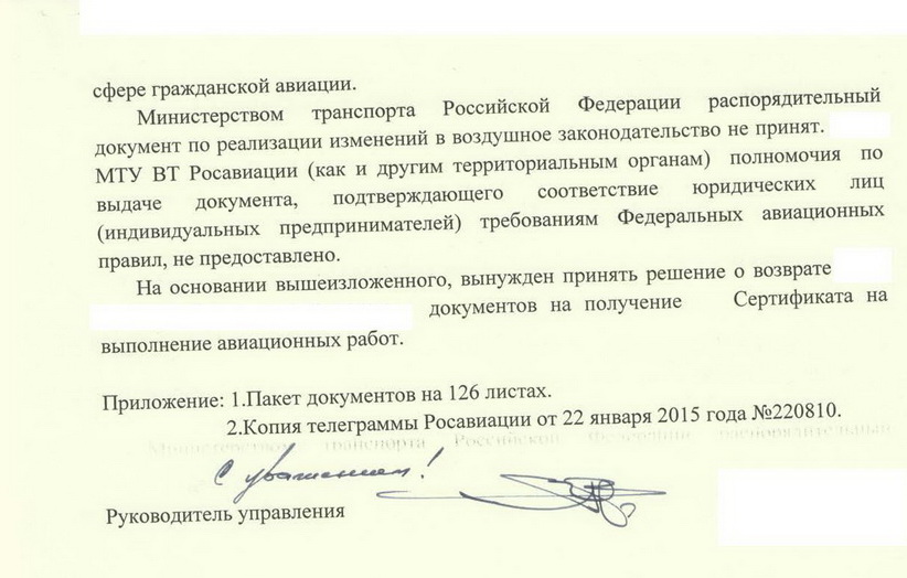 На основании вышеизложенного, вынужден принять решение о возврате документов на получение Сертификата на выполнение авиационных работ."