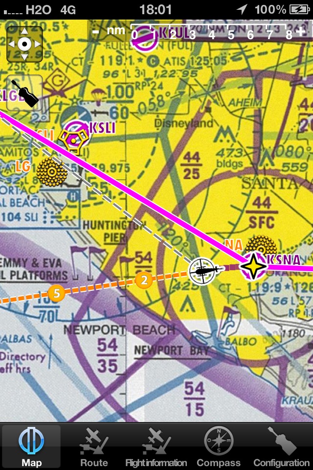 В воздухе запросили разрешение и спокойно прошли прямо над международным аэропортом John Wayne (KSNA). Под нами взлетал А320. Никто никому не мешал.