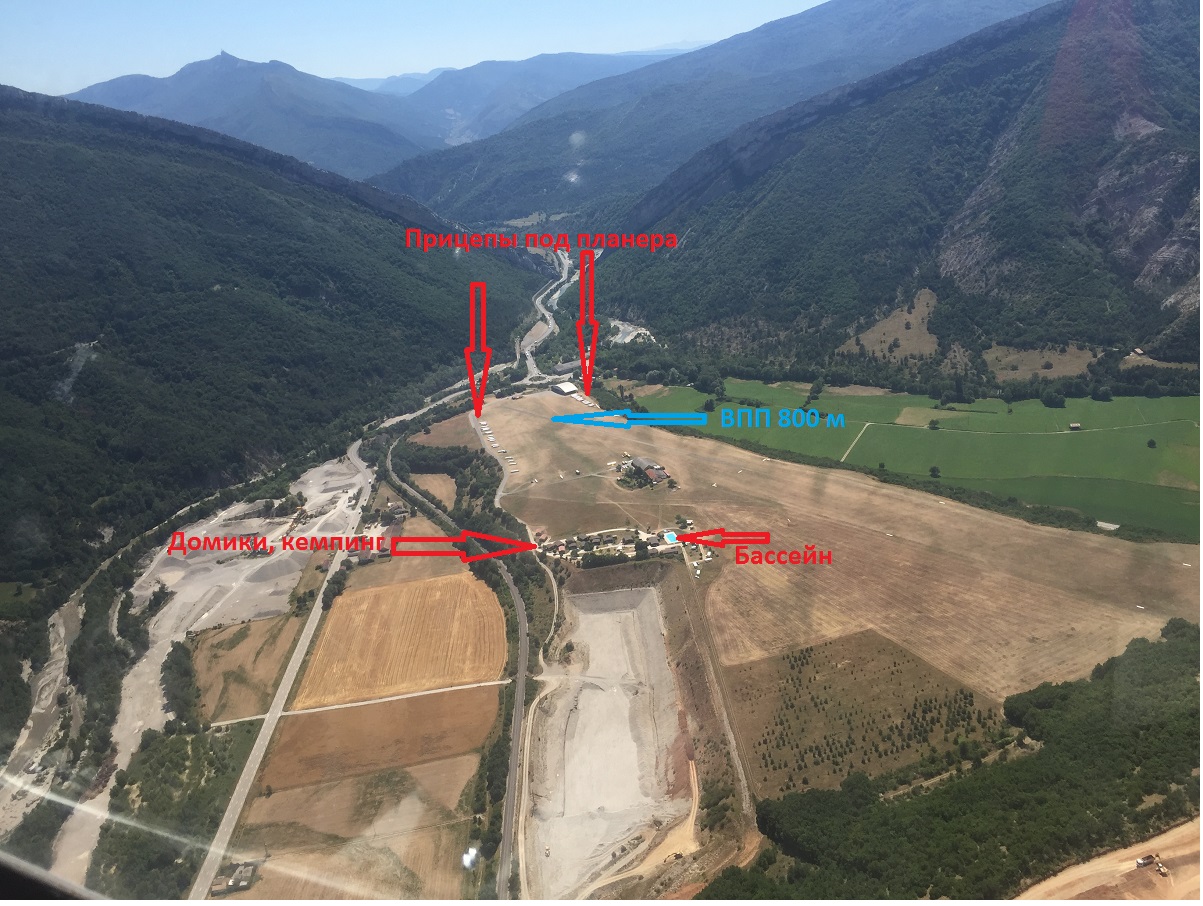 Аэродром в 5 минутах езды от малюсенького селения La Batie Motnsaleon (как говорил наш друг-инструктор Игорь, "У нас в ЛАБАТЯХ"...). Под 50 планеров на земле. 2 самолетика-буксировщика. Кафе, ангары. Кемпинг с бассейном (с проточной холоднющей водой), стиральным машинами, столами, холодильниками - все в тени деревьев. Более капитальное строение, где в темном зале проводят брифинги: самые опытные и уважаемые пилоты дают подробнейший обзор погоды, рекомендации по маршрутам, обсуждение чьих-то и своих рекордов и писем-бреда заповедников.